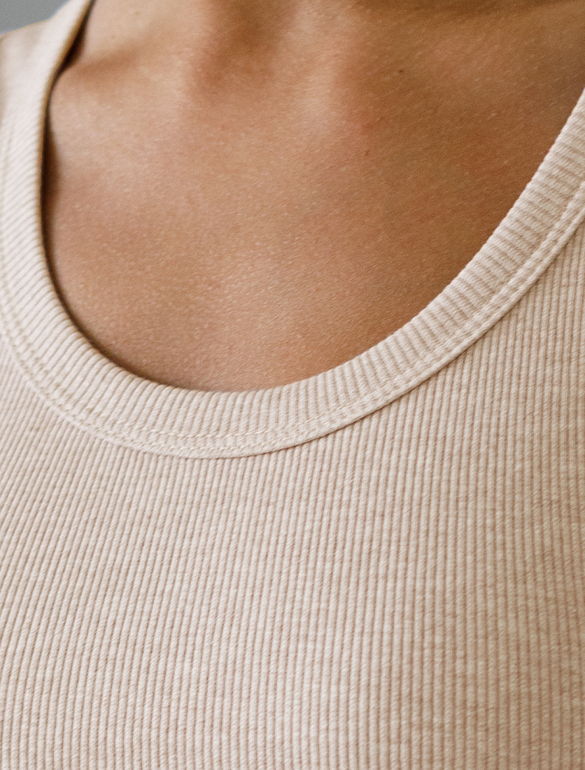 Топ выполнен из фактурного трикотажа в рубчик. Благодаря мягкой хлопковой ткани в рубчик, топ не будет стеснять движения. Эластан в составе также способствует комфорту и формоустойчивости изделия. Модель идеально сочетается в костюме с шортами D48.007 и брюками D44.121 95%Хлопок 5%ПУ