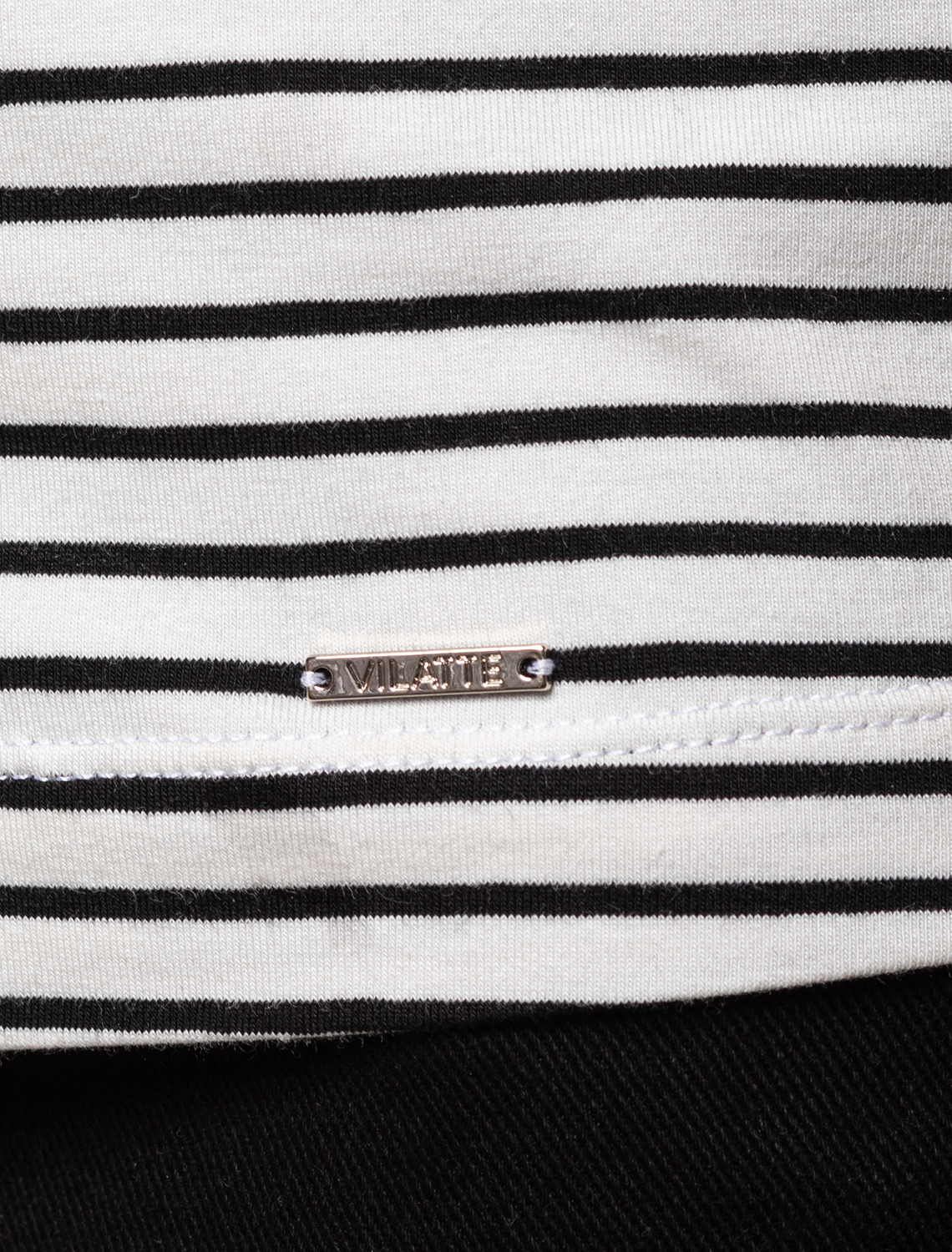 Топ с воротом как у водолазки выполнен из премиального хлопка. Наличие эластана в составе изделия способствует формоустойчивости. Модель хорошо будет сочетаться в комплекте с жакетом или кардиганом, так как отсутствие рукавов позволит комфортное использование в многослойных образах. Из украшений металлический логотип бренда.