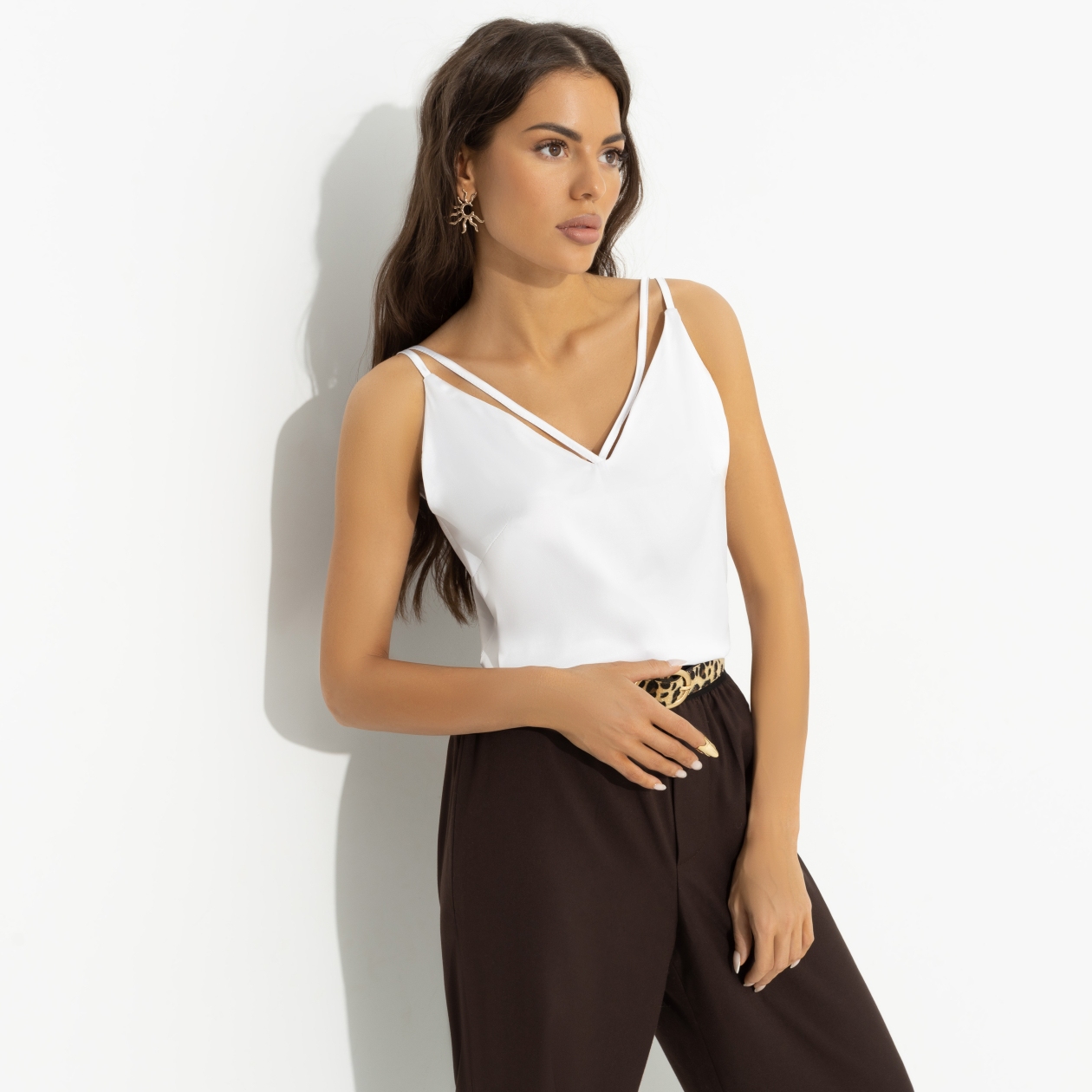 Если тебя остановят на улице и спросят что-то из базовой школьной программы, расскажи, что белый топ обязателен в любом гардеробе. Это более прикладное знание, чем вызубренный закон Бойля-Мариотта. Топ прямого силуэта. Двойной слой ткани в зоне груди. Топ удлиненный, хорошо смотрится в заправленном виде и навыпуск.