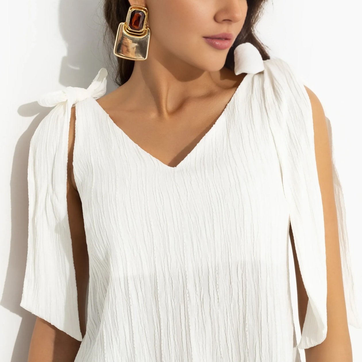 Топ CHARUTTI уже отправился к Ирине Шейк. Абсолютный стиль топ-модели. Простой, но эффектный. Ходят слухи, что в подобном экземпляре она встретила Криштиану Роналду. Он не смог устоять. Топ прямого кроя. Материал изделия текстурный – жатый. Топ дополнен широкими завязками на плечах, которые можно сформировать в объемные банты. Есть подклад в зоне декольте.