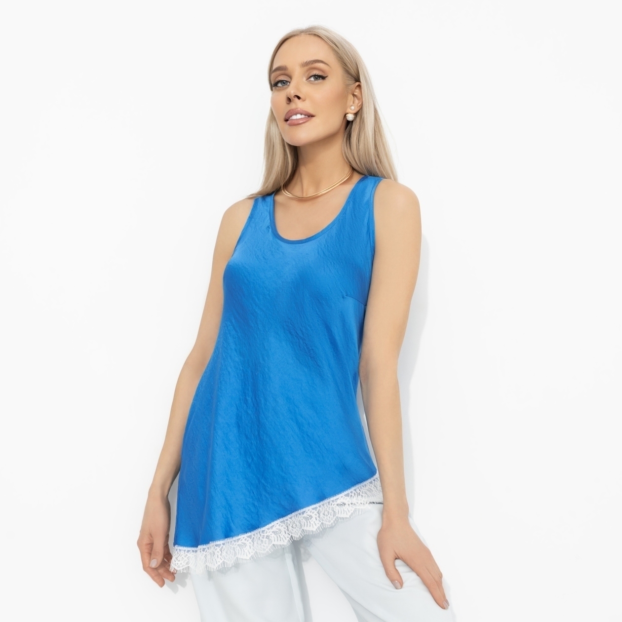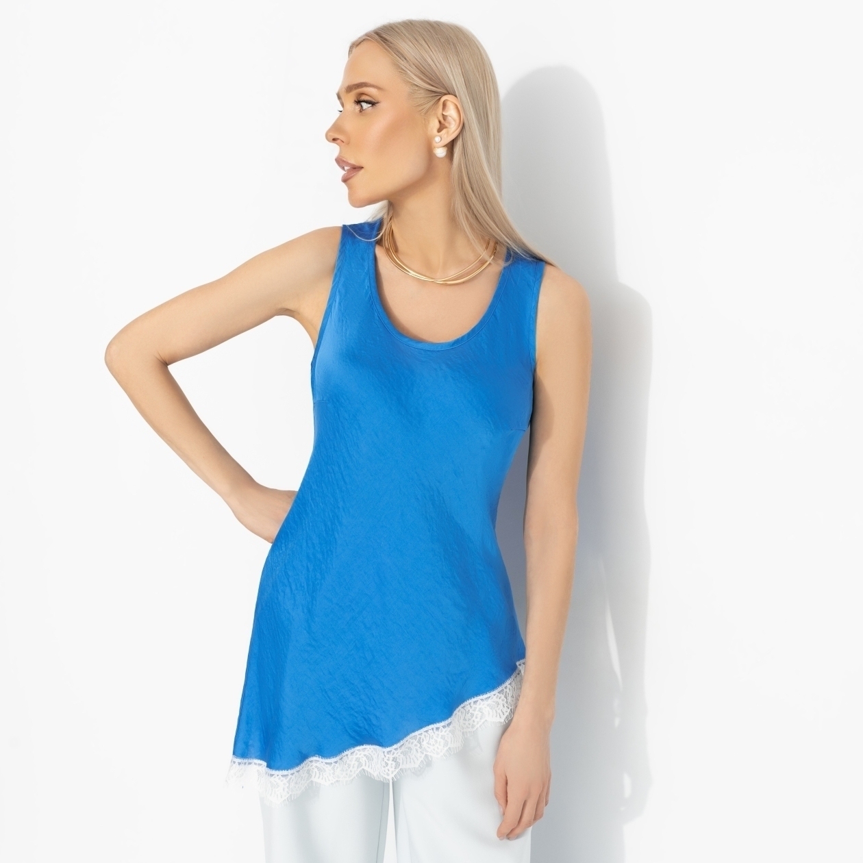 Есть женщины, которым идут яркие цвета и высокий контраст – они будто зажигают пространство вокруг. Топ ЧАРУТТИ «Следи за мной» как раз для таких: уверенных, заметных, тех, кто не растворяется в толпе. Синий оттенок работает как акцент силы. Топ свободного силуэта из шелка крэш. Мягкий округлый вырез, комфортная посадка. Струясь по коже, топ будто шепчет: все смотрят, улыбнись.
