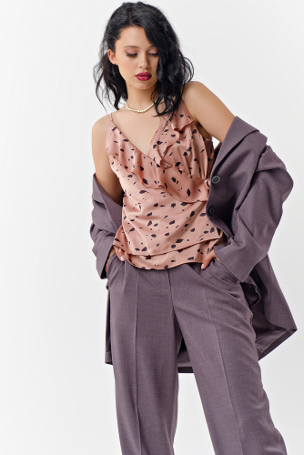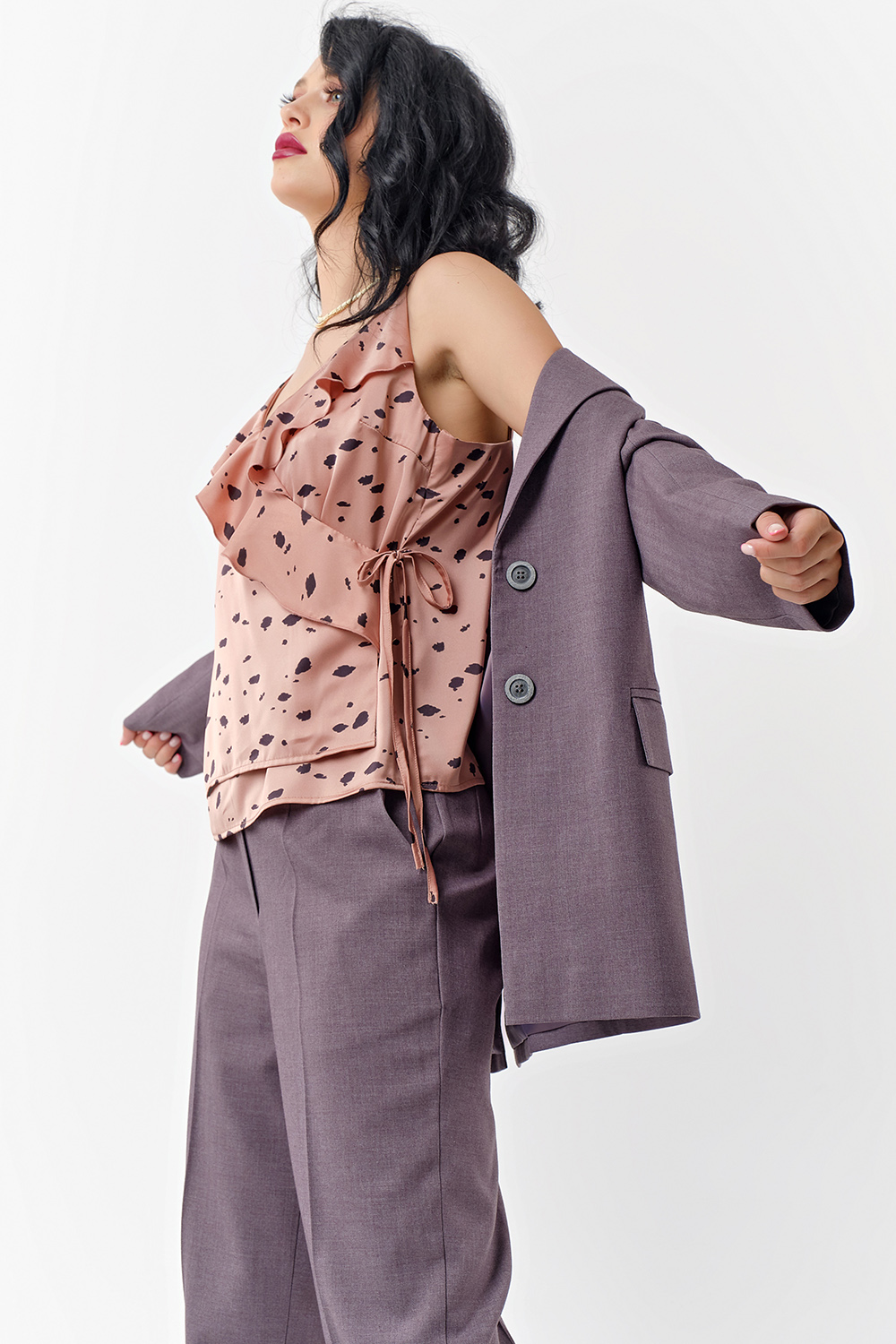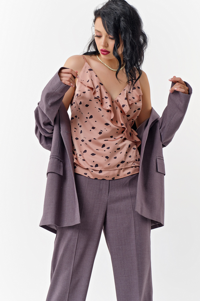 • Особенности: Топ на бретелях полуприлегающего силуэта из атласной ткани. Детали: тонкие бретели с регуляторами, перед на запах, волан по горловине переда. Застежка на завязки запаха.