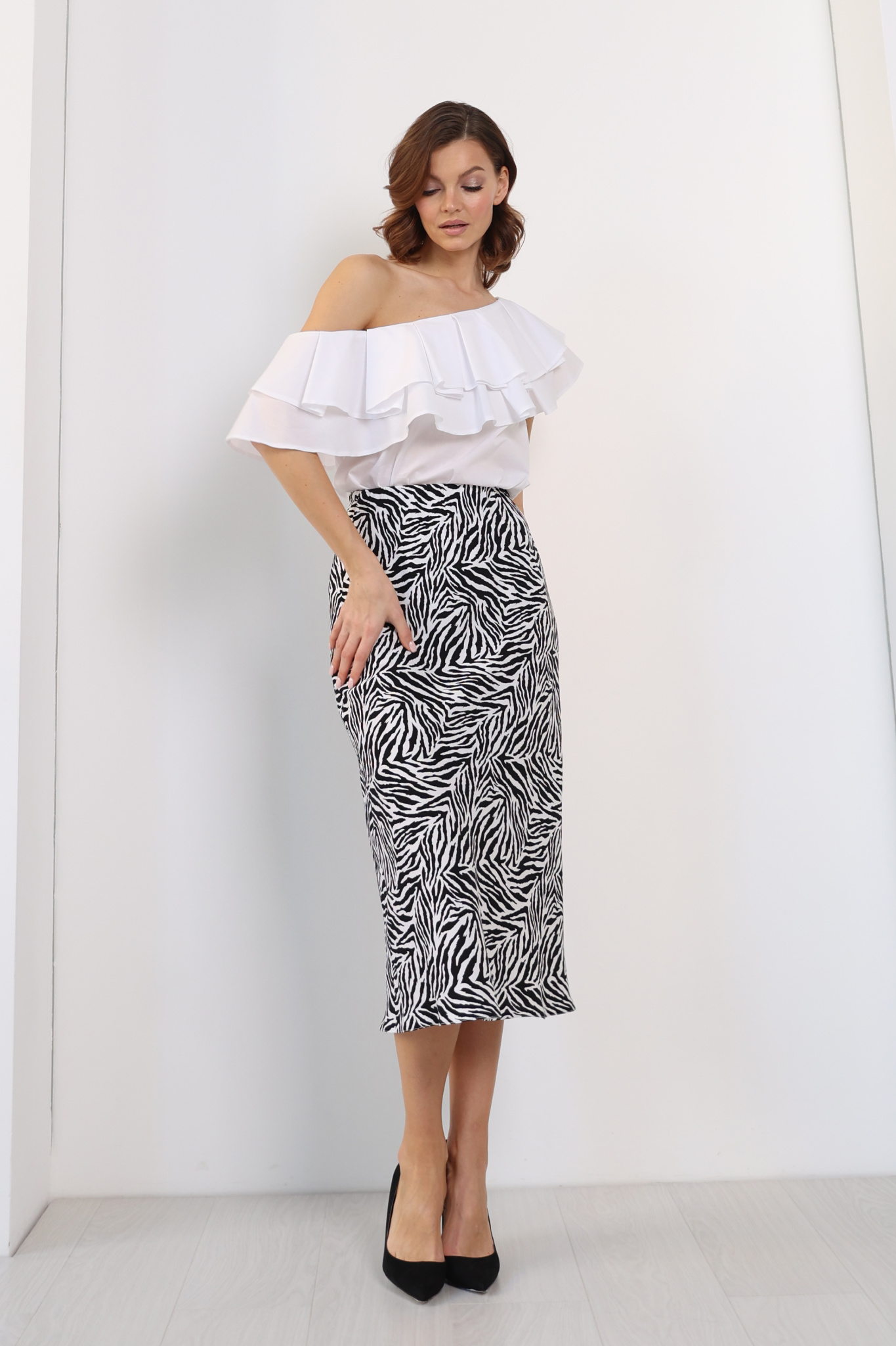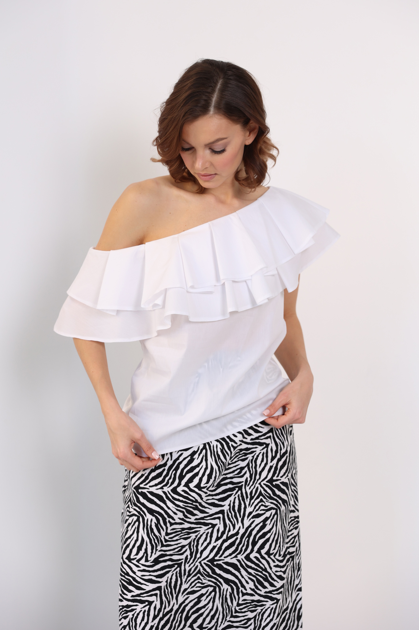 Топ на одно плечо с асимметричным верхом и двумя воланами по кругу.