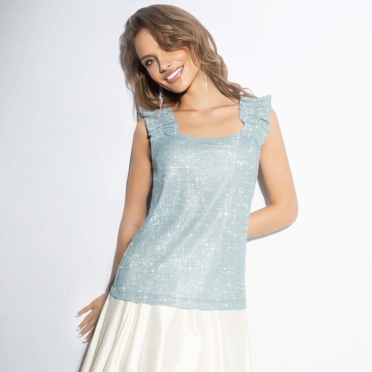 Топ для нарядного образа в стиле quiet sparkle – тихое сияние, когда вместо громких пайеток акцент на деликатном металлическом блеске фактуры. Романтичные оборки на плечах поддерживают настроение праздника, при этом образ остаётся утончённым и уместным не только в Новый год, а на любой вечеринке. Каждый твой шаг ловит свет – будто тебя всюду сопровождают софиты!