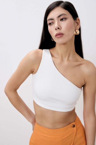 Базовый кроп-топ из трикотажного полотна в рубчик. Модель асимметричная, прилегающего силуэта.