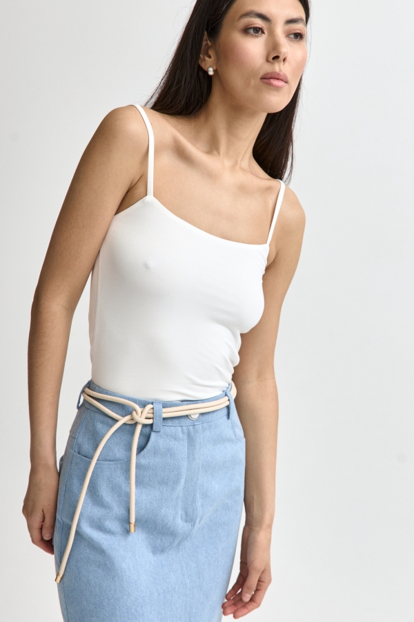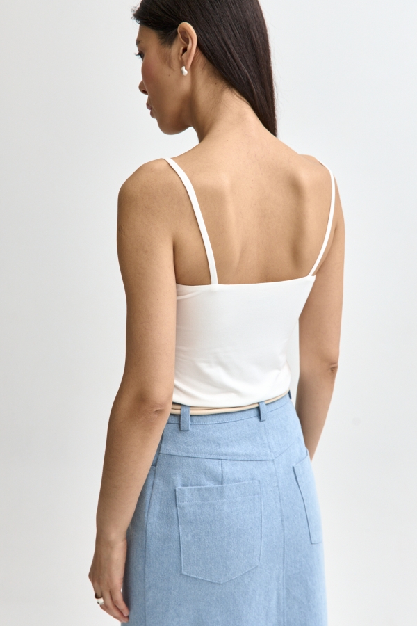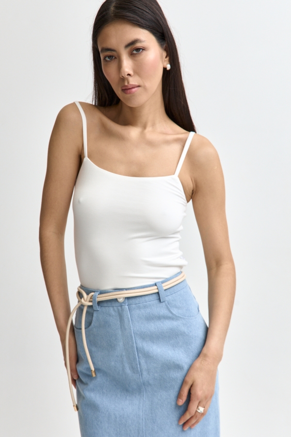 Приятный базовый топ из трикотажного вискозного полотна. Топ прилегающий двойной, с тонкими бретелями.