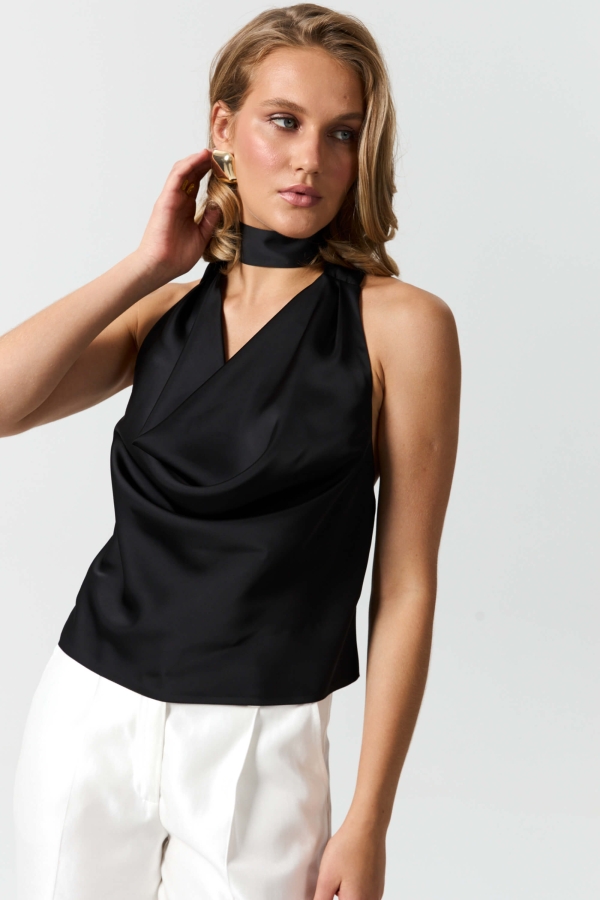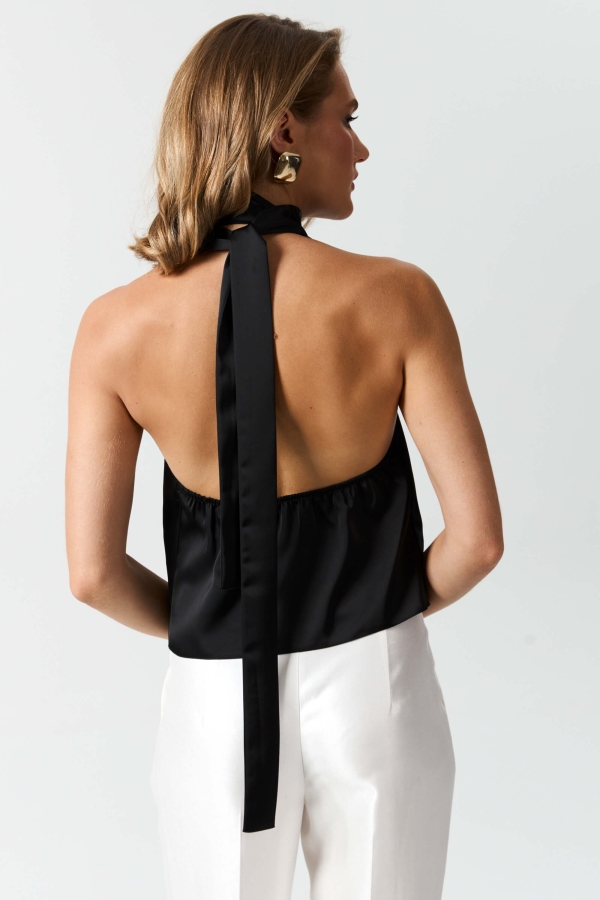 Топ с открытой спинкой из атласа. Модель полуприлегающего силуэта с открытыми плечами и качелькой на полочке, по горловине завязки и регулятор. На спинке узкая резинка по верху изделия.