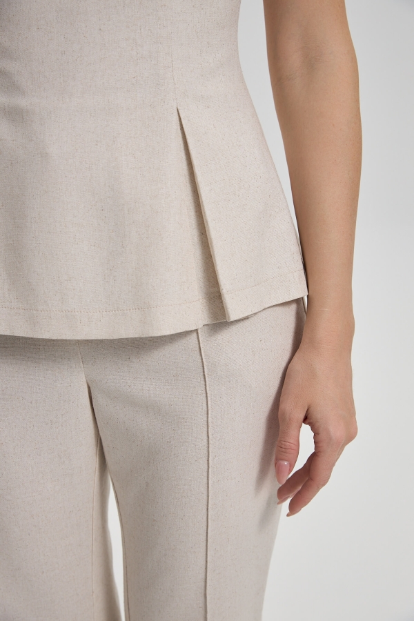 Лаконичный топ из льняного полотна на подкладке. Модель прилегающего силуэта с баской, с рельефами и защипами на полочке и спинке. Застежка на потайную молнию на спинке. Изделие на подкладке из легкого хлопка.