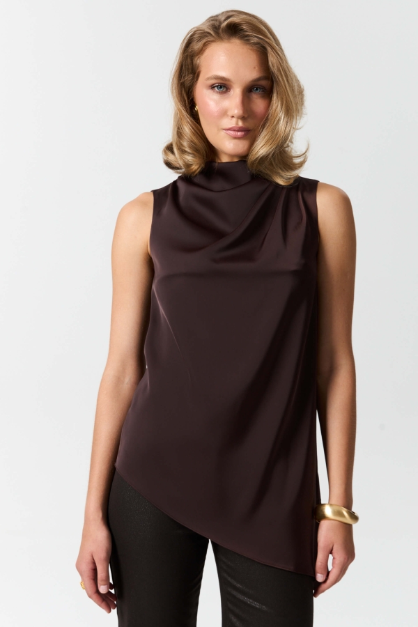 Топ асимметричного кроя из атласа высокого качества. Модель свободного силуэта. По переду декоративные складки, переходящие в стойку. По спинке застежка на петлю и пуговицу. Низ изделия ассиметричный.