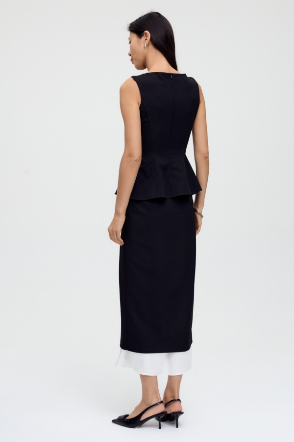 Блуза с баской из плотного костюмного полотна. Модель полуприлегающего силуэта. По переду рельефы, формирующие утонченный силуэт. По спинке рельефы и застежка на потайную молнию.