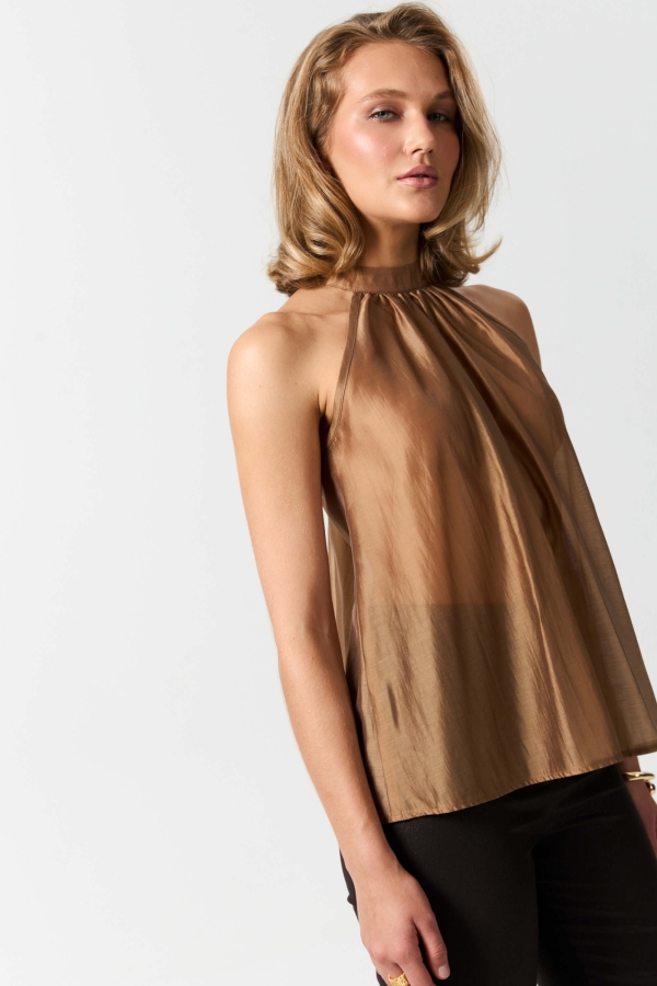 Топ из воздушной вискозы благородного оттенка. Модель свободного силуэта. Горловина оформлена стойкой со сборкой. По спинке застежка на петлю и пуговицу. В комплекте тонкий пояс из основной ткани.