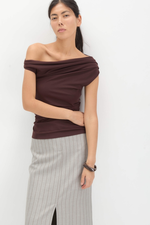 Асимметричный топ из вискозы. Модель прилегающего силуэта с асимметричной линией плеча. По линии талии сборки. Горловина на широкой обтачке по переду и спинке. Возможно менять асимметрию с одного плеча на другое.
