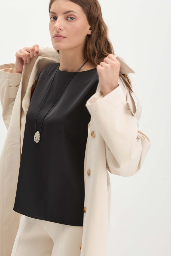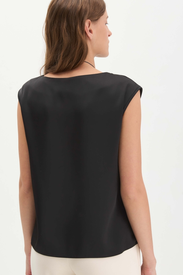 Базовый топ из атласа высокого качества. Модель прямого силуэта. Без рукавов, плечо слегка спущено. Горловина в форме “лодочки”.