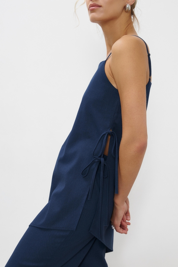 Топ асимметричного кроя из льняного полотна. Модель свободного силуэта с декоративным косым краем. Бретели на регуляторах. В боковом шве функциональные завязки.