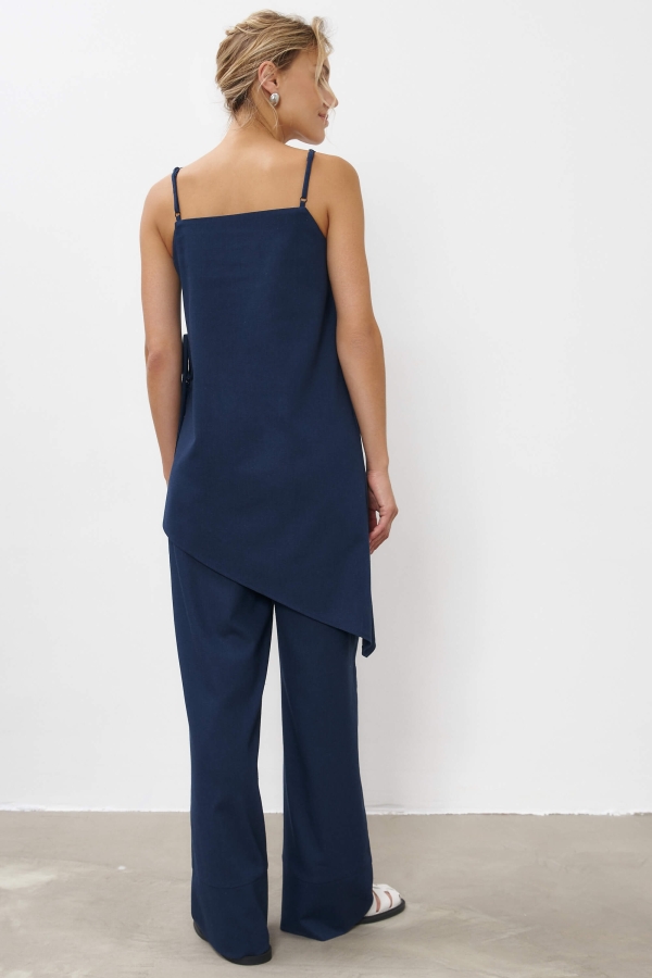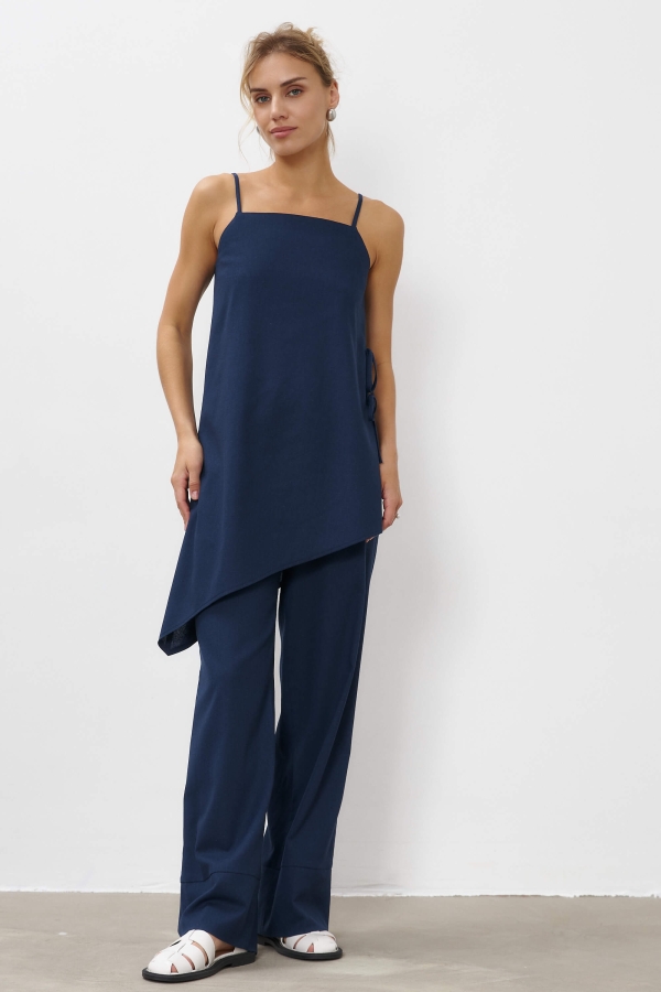 Топ асимметричного кроя из льняного полотна. Модель свободного силуэта с декоративным косым краем. Бретели на регуляторах. В боковом шве функциональные завязки.