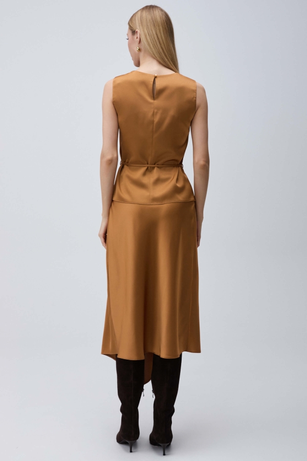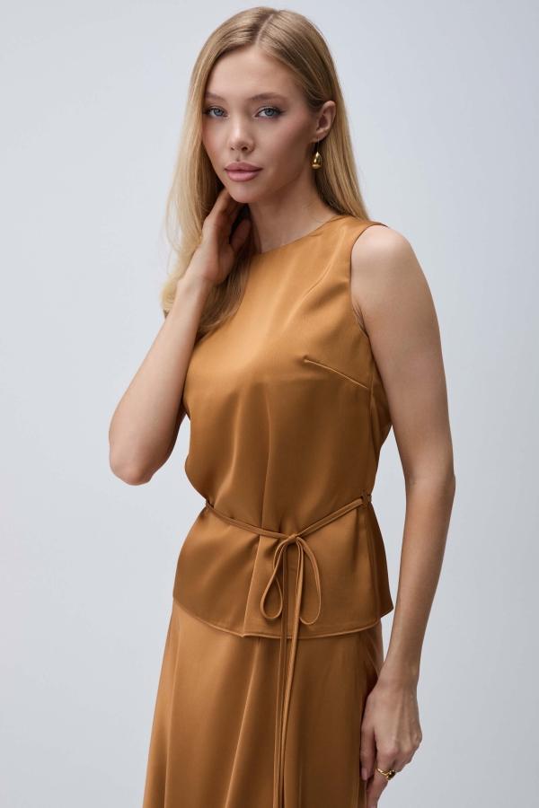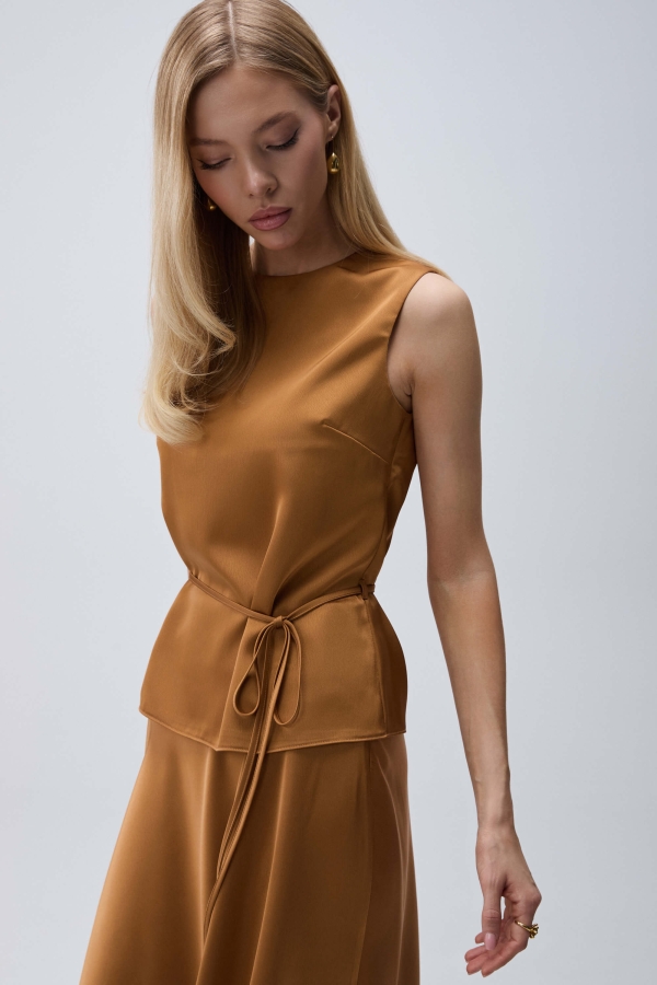 Топ из фактурного атласа. Модель свободного силуэта. По спинке застежка на петлю и пуговицу. В комплекте узкий пояс из основной ткани.