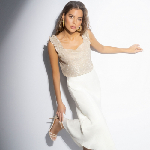 Расскажем тебе сказку о том, как русалка в ночь праздника из моря попала прямиком на танцпол. Серебристый люрекс мерцает, как чешуйки в лунном сиянии, а каждый луч неона скользит по ткани будто волна. Стоит чуть повернуть плечо – и искры света раскрашивают ночь. Все вокруг знают – за ее образом точно кроется невероятная глубина. Прямой силуэт с фигурным вырезом и воланами на бретелях позволяет сочетать модель и с юбками, и с брюками, создавая эффектный вечерний образ.