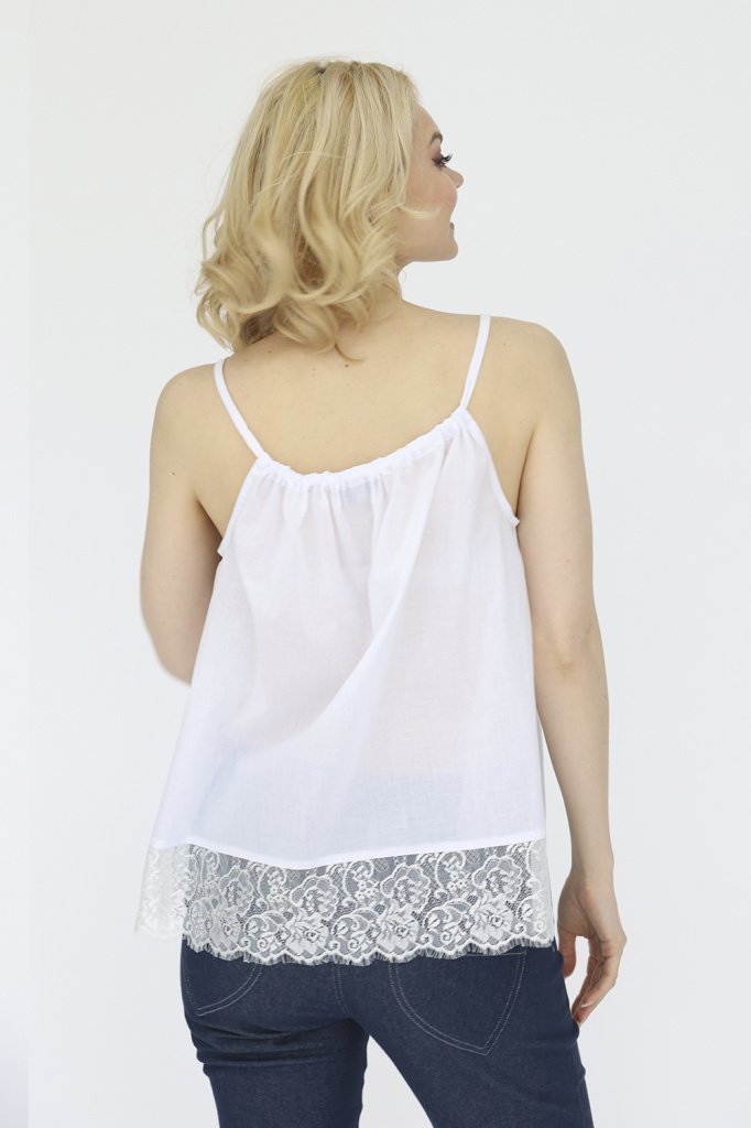 Топ на тонких бретелях со сборкой и завязкой на груди. Отделка широким кружевом по низу