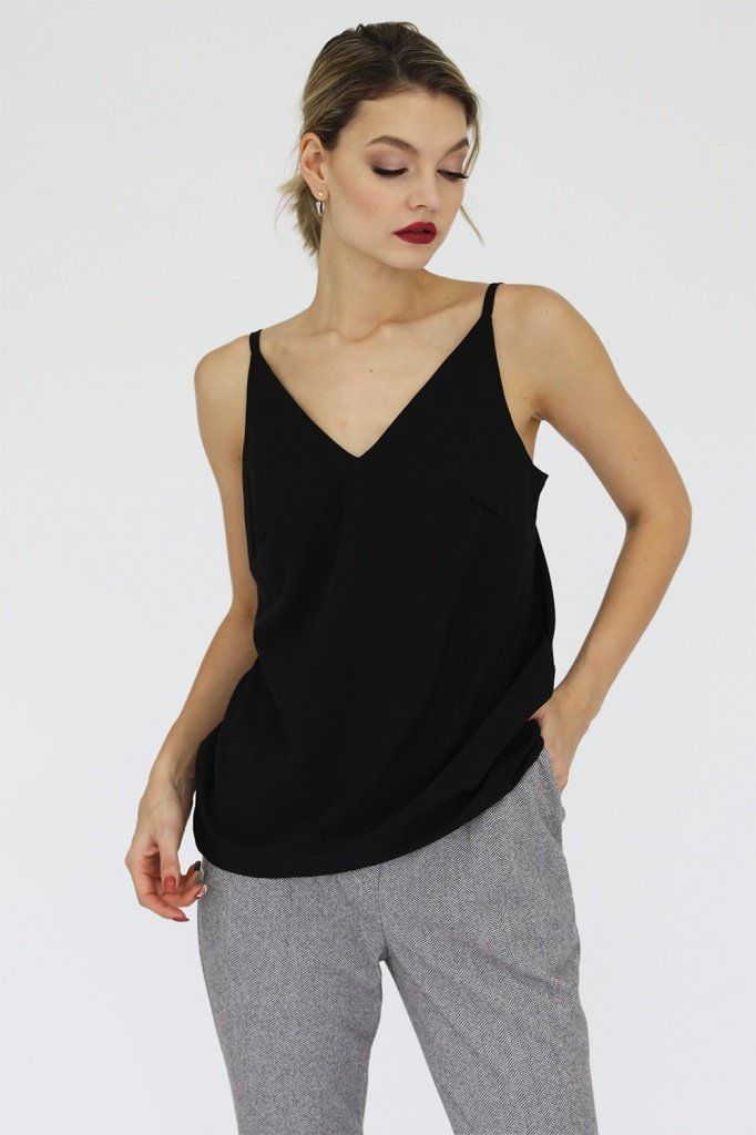 Топ из искусственного шелка с v-образным вырезом и тонкими бретелями регулируемой длины.