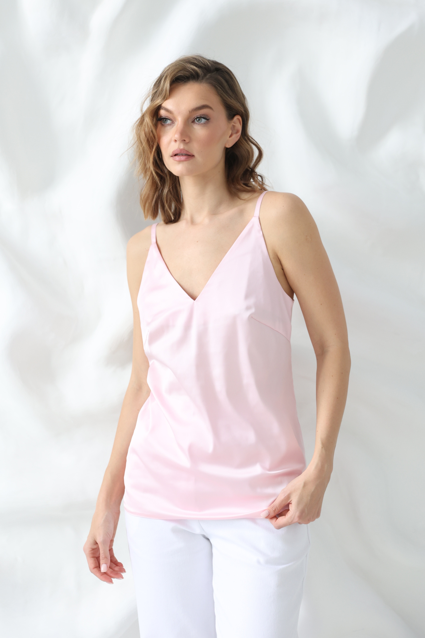 Топ из искусственного шелка с v-образным вырезом и тонкими бретелями регулируемой длины.