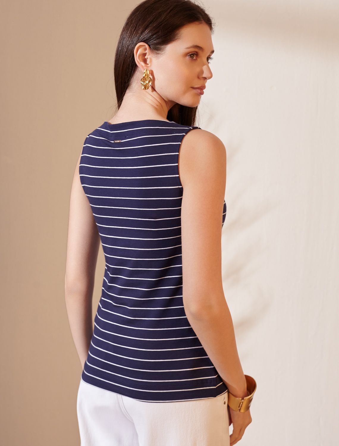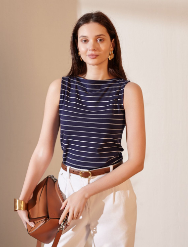 Топ темно-синего цвета в белую полоску с вырезом лодочка выполнен из премиального эластичного хлопка плотностью 170 Г/м2. Прямой силуэт подходит любому типу фигуры, в том числе и на большие размеры. Вырез лодочка придает образу изысканность и стиль. Полоска всегда актуальна и добавляет базовому топу эффектности. Благодаря тому, что материал тянется, топ хорошо садится по фигуре и обеспечивает комфорт на протяжении всего дня. Эластичное полотно мягко обхватывает силуэт, не стесняя движений. Приятный к телу хлопок не вызывает раздражения и подходит для ежедневной носки. Сочетание гладкой текстуры и эластичных свойств позволяет топу выглядеть аккуратно и стильно даже после множества стирок. Длинная майка без рукавов идеально подойдет для создания свежих и модных образов на каждый день.