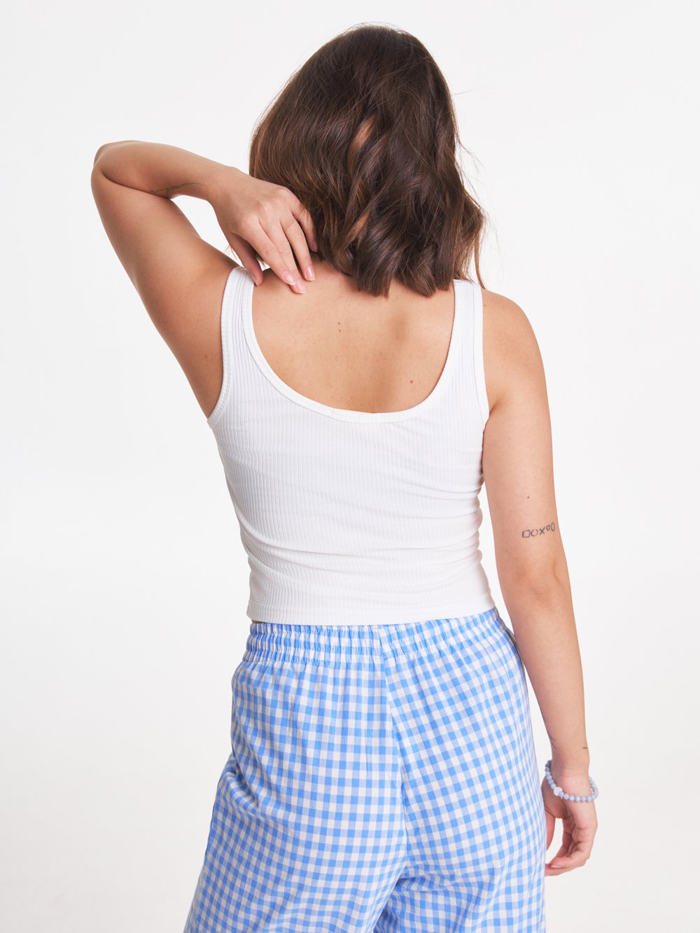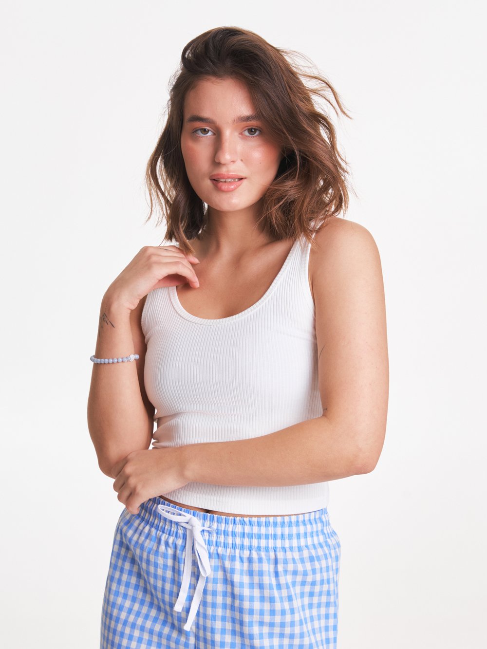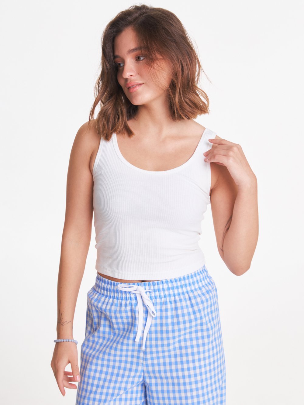 Топ из трикотажа с окантовкой из ткани основы, длина до линии талии.