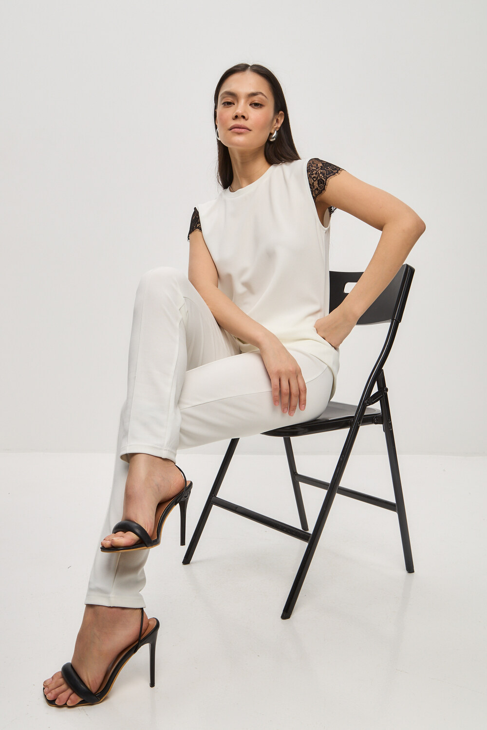 Женский брючный праздничный костюм от российского производителя бренда женской одежды. Основой комплекта являются зауженные классические брюки с резинкой на талии, с элегантными прошитыми стрелками, отлично подчеркивающие фигуру. В комплекте блуза сложного геометрического кроя с удлиненной спинкой на молнии, с вырезом-капелькой, рукавами, выполненными из тонкой кружевной ткани черного цвета. Необычное дизайнерское решение позволило совместить элегантную классику и эффектный стиль. Базовый вариант подойдет для повседневного ношения в офис или на деловую встречу. На любом мероприятии Вы будете чувствовать себя нарядно и комфортно.