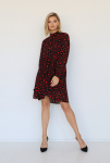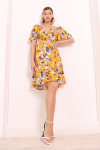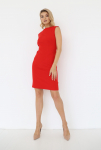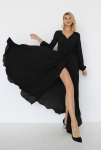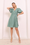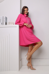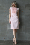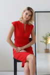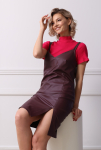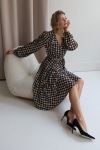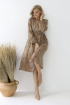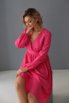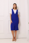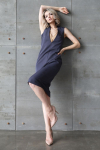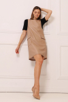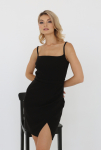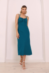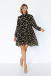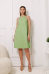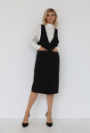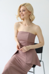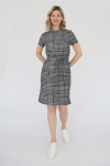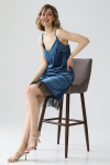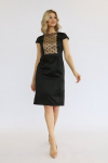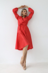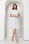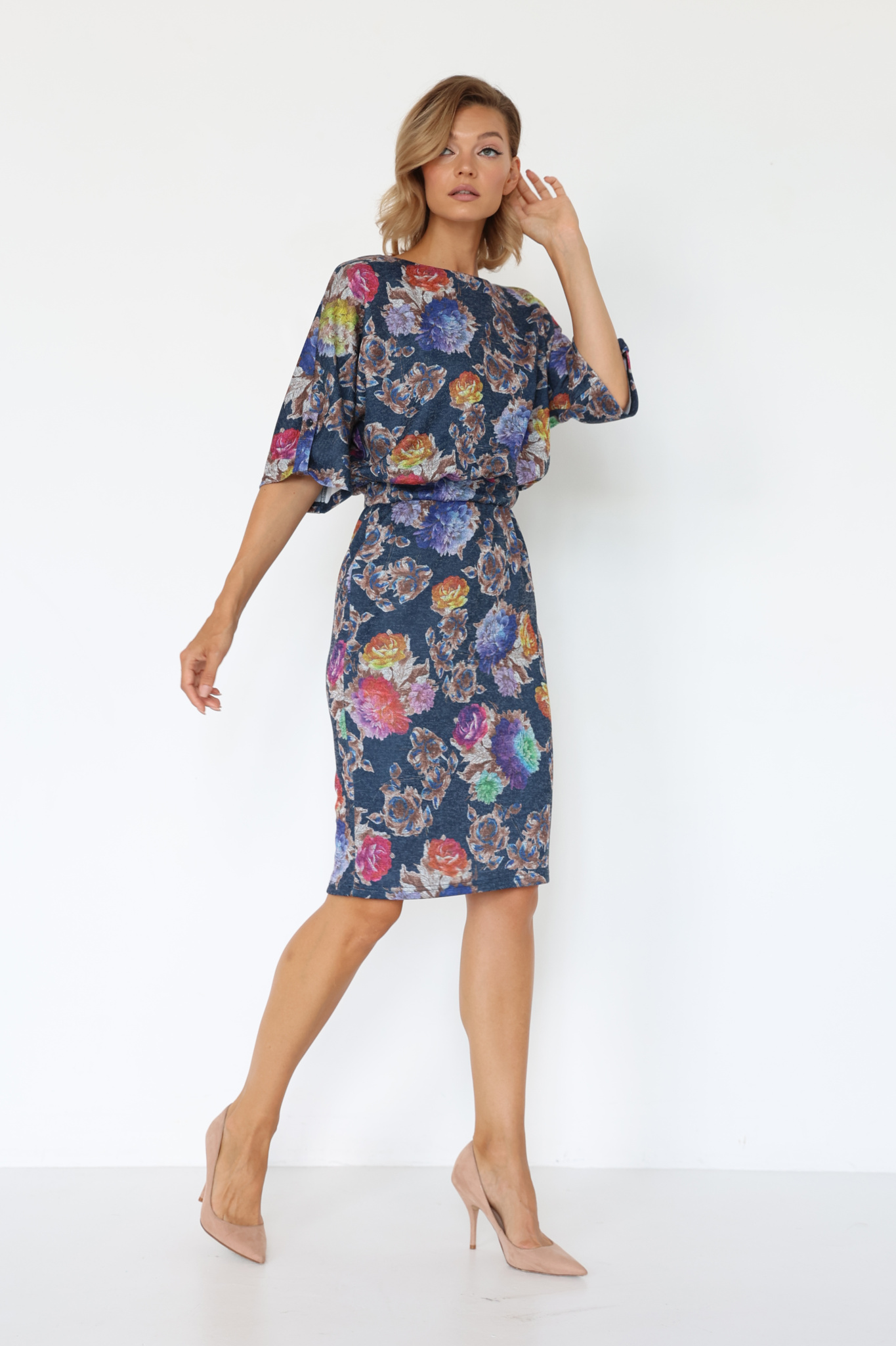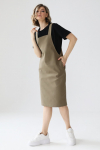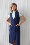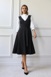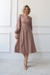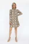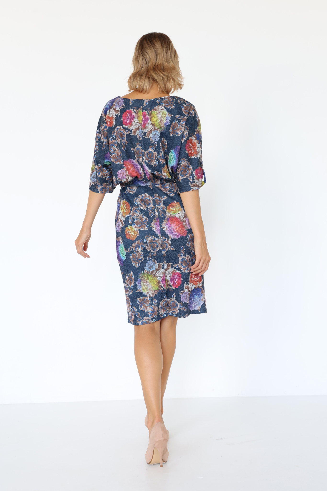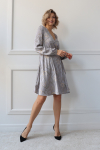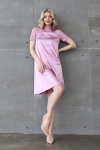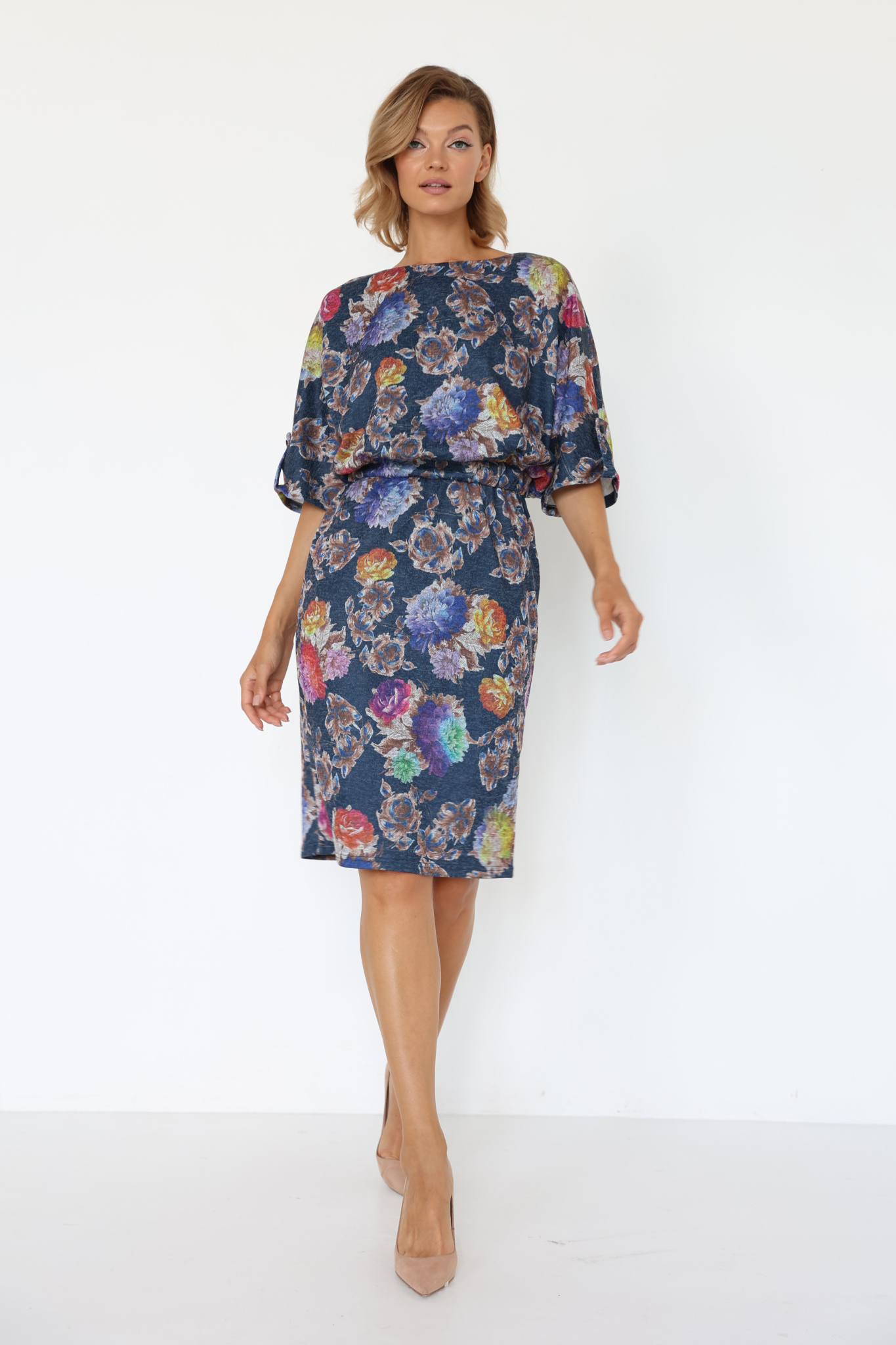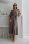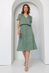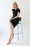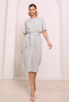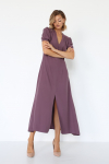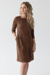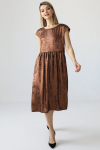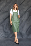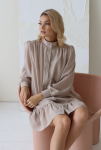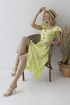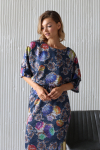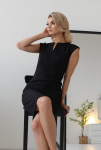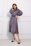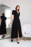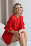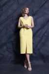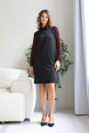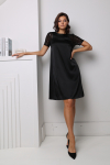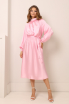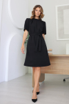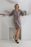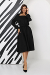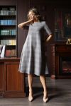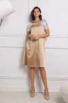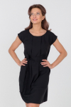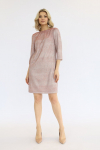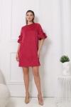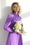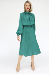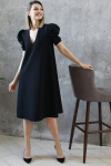 Платье с кулиской по линии талии. Рукав типа «летучая мышь» длиной ¾. Декоративные паты на рукавах. Шлица сзади.