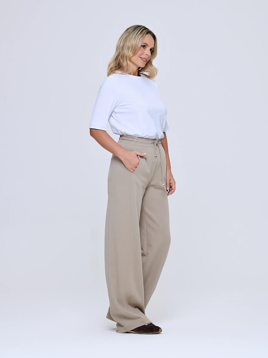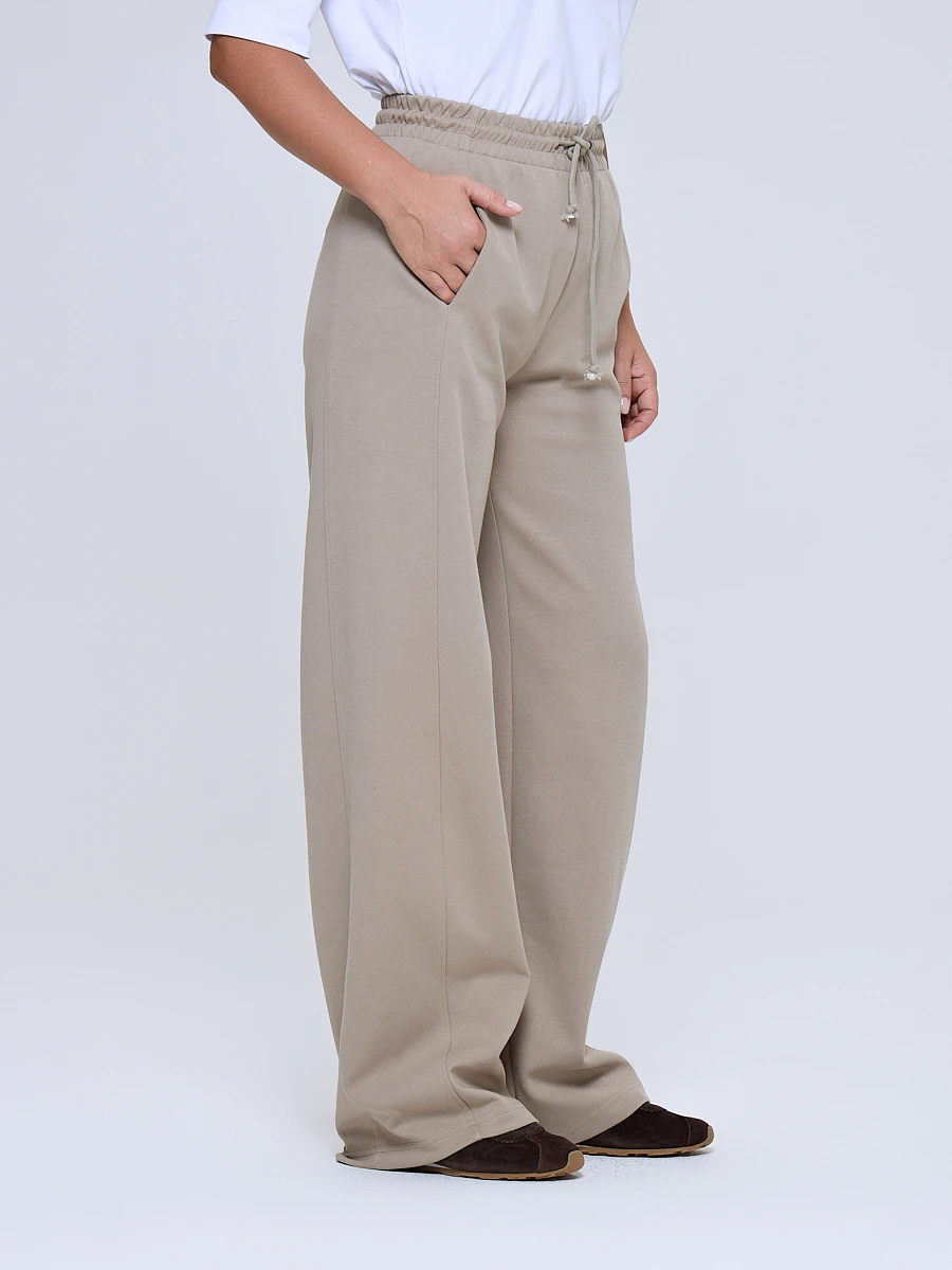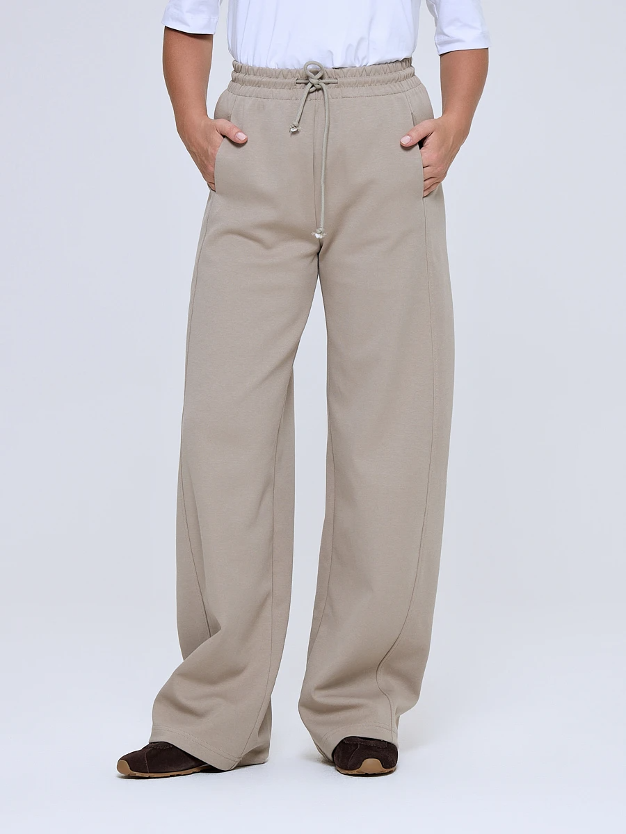 Женские трикотажные брюки в бежевом цвете подарят комфорт на каждый день. Мягкий материал с высоким содержанием хлопка приятен к телу, обеспечивает воздухопроницаемость и комфортное ощущение даже при длительной носке. Широкий крой в сочетании с эластичным поясом и завязками создаёт удобную посадку, которая не сковывает движений. Карманы по бокам добавляют практичности, а свободный силуэт делает модель универсальной для разных типов фигур.