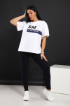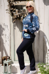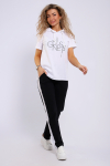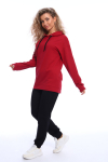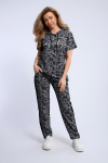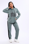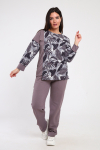 Костюм состоит из толстовки и брюк. Толстовка прямого кроя с капюшоном на завязках, рукава на манжетах. Брюки полуприлегающего силуэта с боковыми карманами, эластичным поясом на резинке и манжетами. Оригинальное сочетание рисунка толстовки и черных брюк.