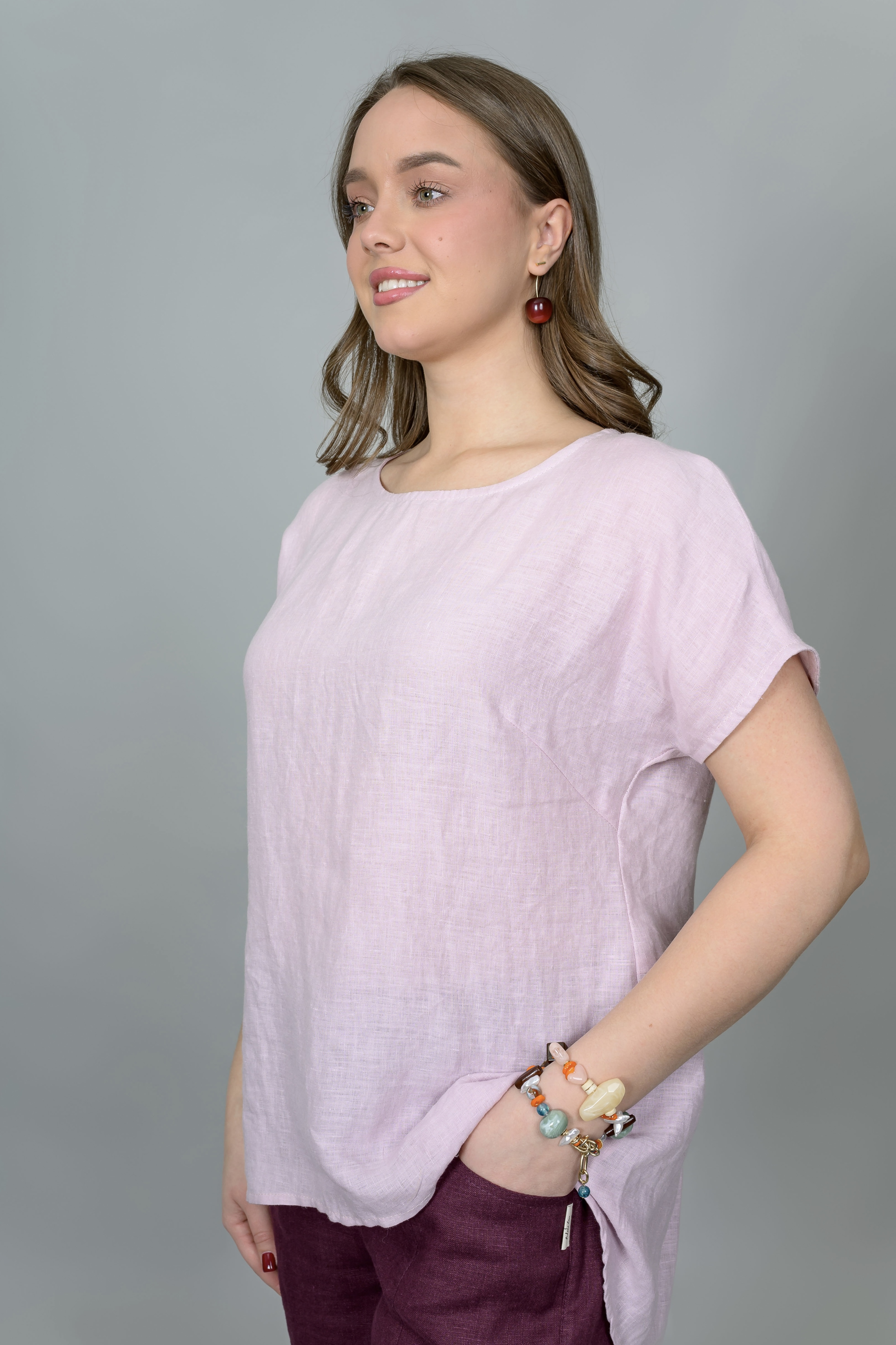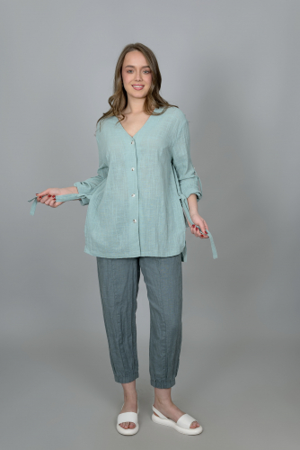 На передней части блуза имеет нагрудную вытачку, что обеспечивает хорошую посадку на фигуре любой полноты.  Спинка  слегка  удлиненная с  разрезом.