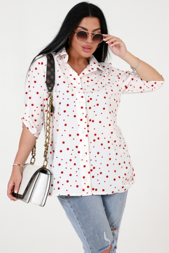 Туника полуприлегающего силуэта на пуговицах и рубашечным воротником. Короткие рукава с отворотными манжетами, закрепленными пуговицами. Карманы в боковых швах. Низ изделия полукруглый с удлиненной спинкой.