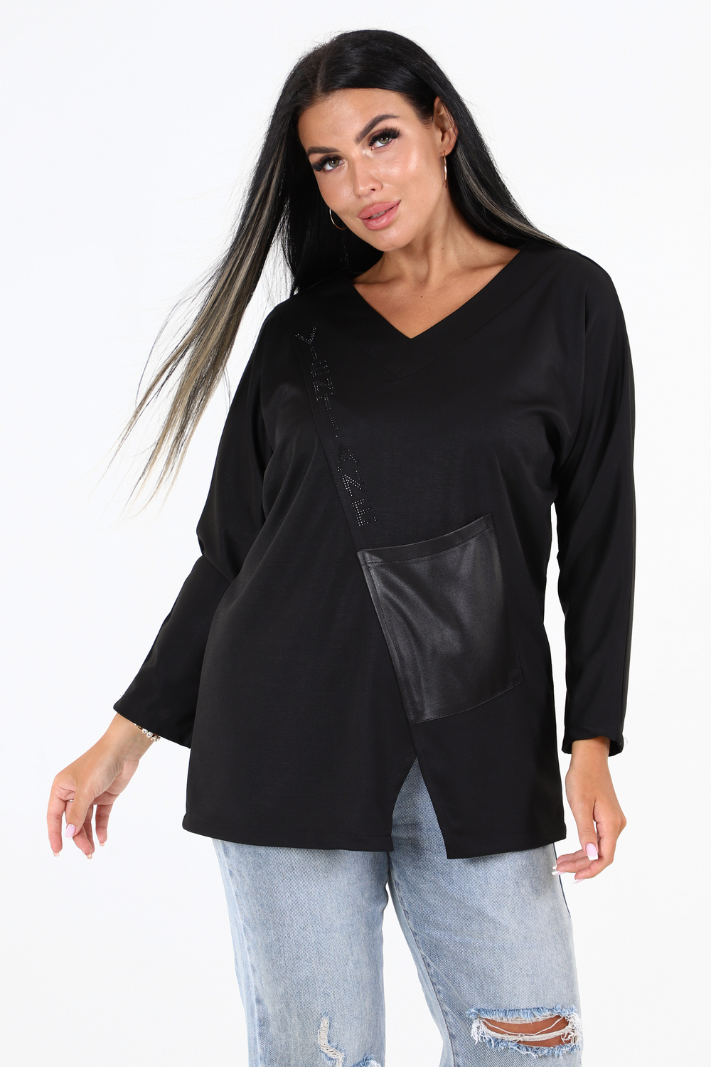 Одна из главных привлекательных черт этой туники наличие на полочке планки, украшенной стразами, которые придают ей неповторимый шик. Это дополнение украшает модель и добавляет ей изысканности, делая тунику идеальной для повседневного и вечернего гардероба.