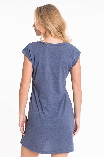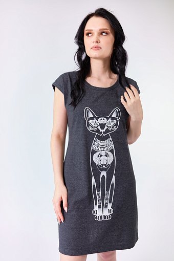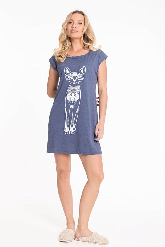 Туника домашняя выполнена из однотонного хлопкового полотна. Покрой прямой, без рукавов, горловина имеет круглый вырез. Проймы и горловина обработаны бейкой. Спереди расположен принт.