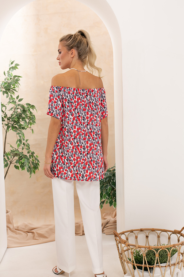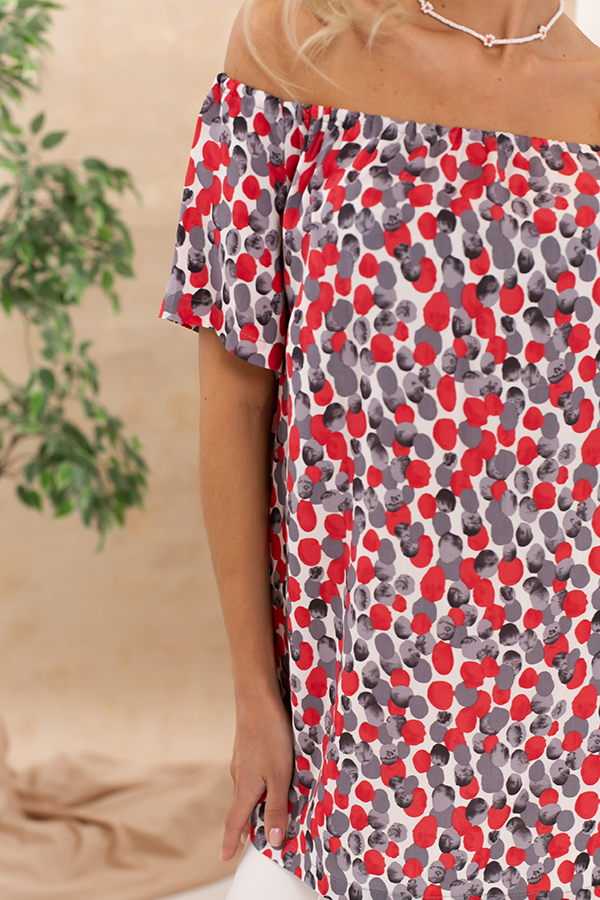 Туника свободного силуэта с открытыми плечами и разрезами в боковых швах из вискозной блузочной ткани. Линия плеч присборена на резинку. Короткий рукав реглан.