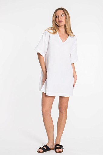 Туника из однотонного муслина. Свободного кроя, со спущенным коротким рукавом, V-образной горловиной. Туника длиной до середины бедра. В боковых швах разрезы.