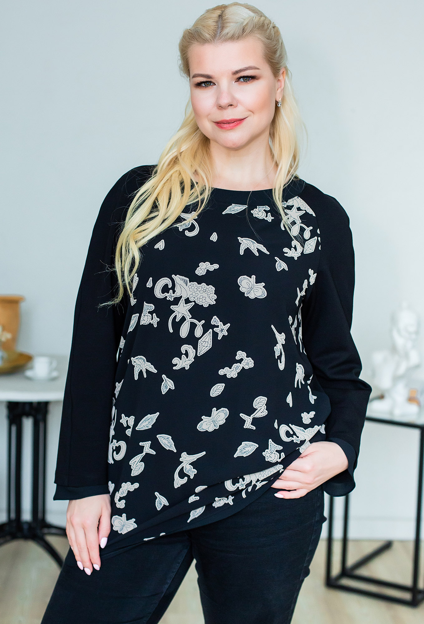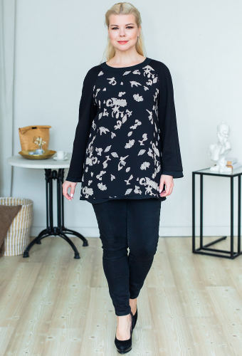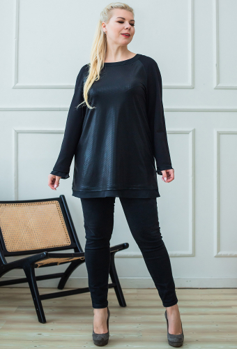 Модель: АСВ 2302 бежево-черный Ро..показатьст: 164 см (девушка на фото ростом 164см) Сезон: Круглогодичный Тип ткани: Вискоза 60%, нейлон 34%, спандекс 6%Туника прямого силуэта с длинным рукавом реглан. Горловина округлая с отделочной обтачкой. По переду декоративная вставка, по низу изделия и рукава декоративная рюш.
