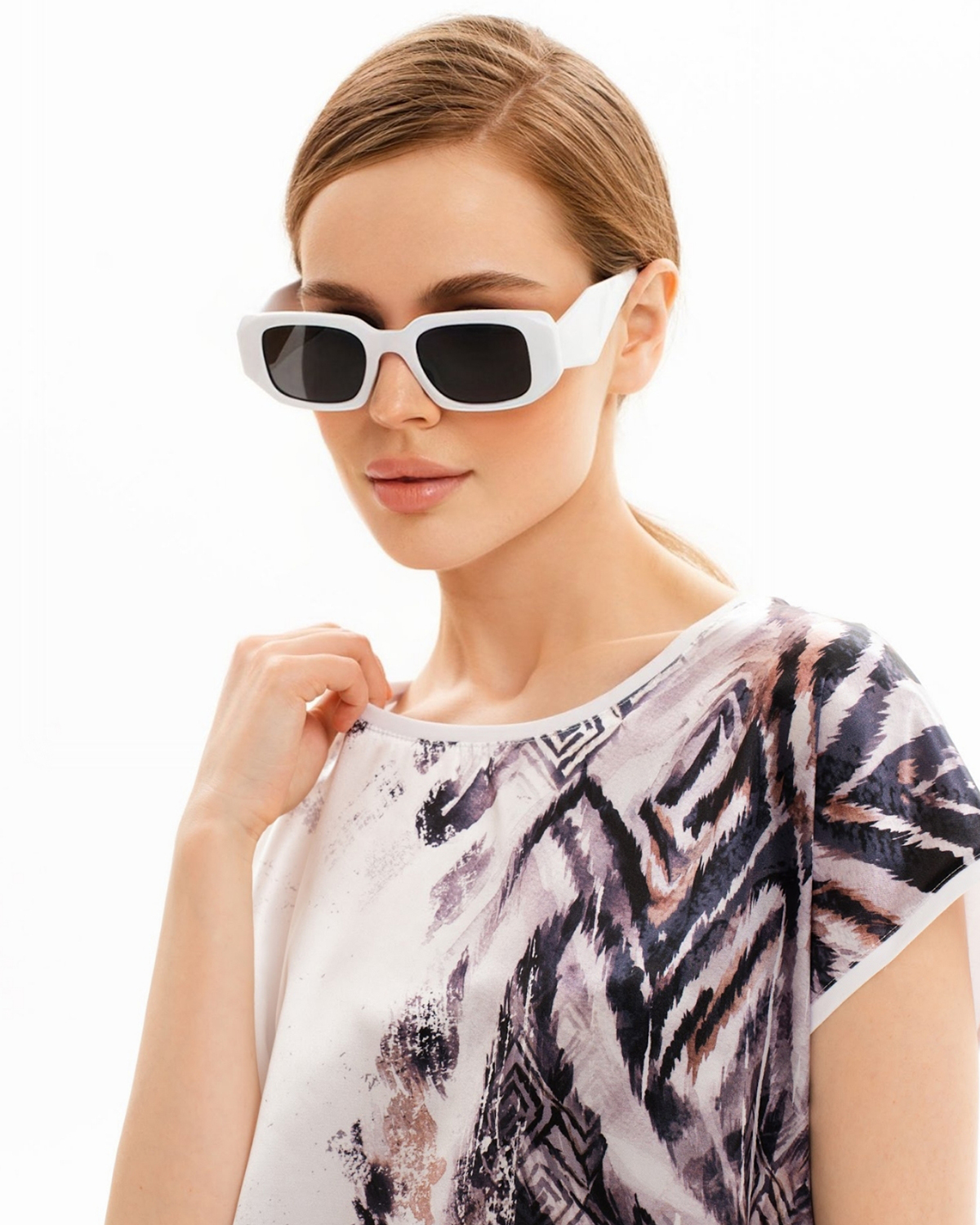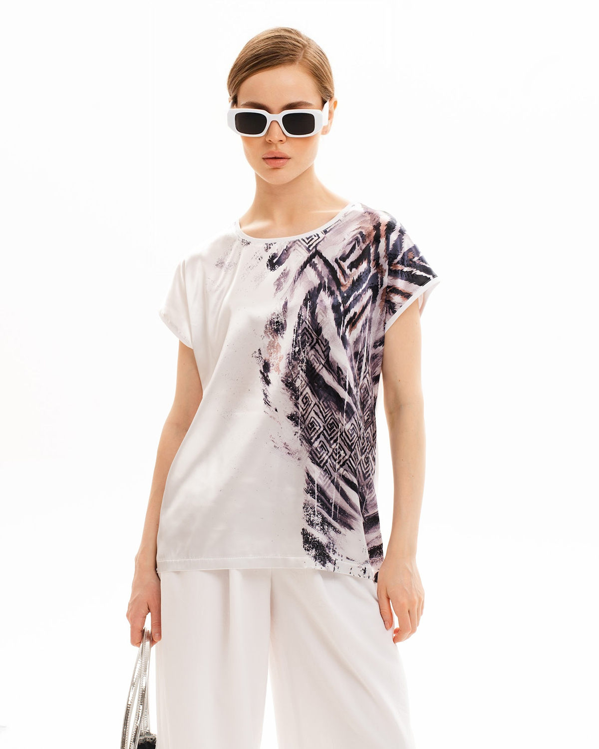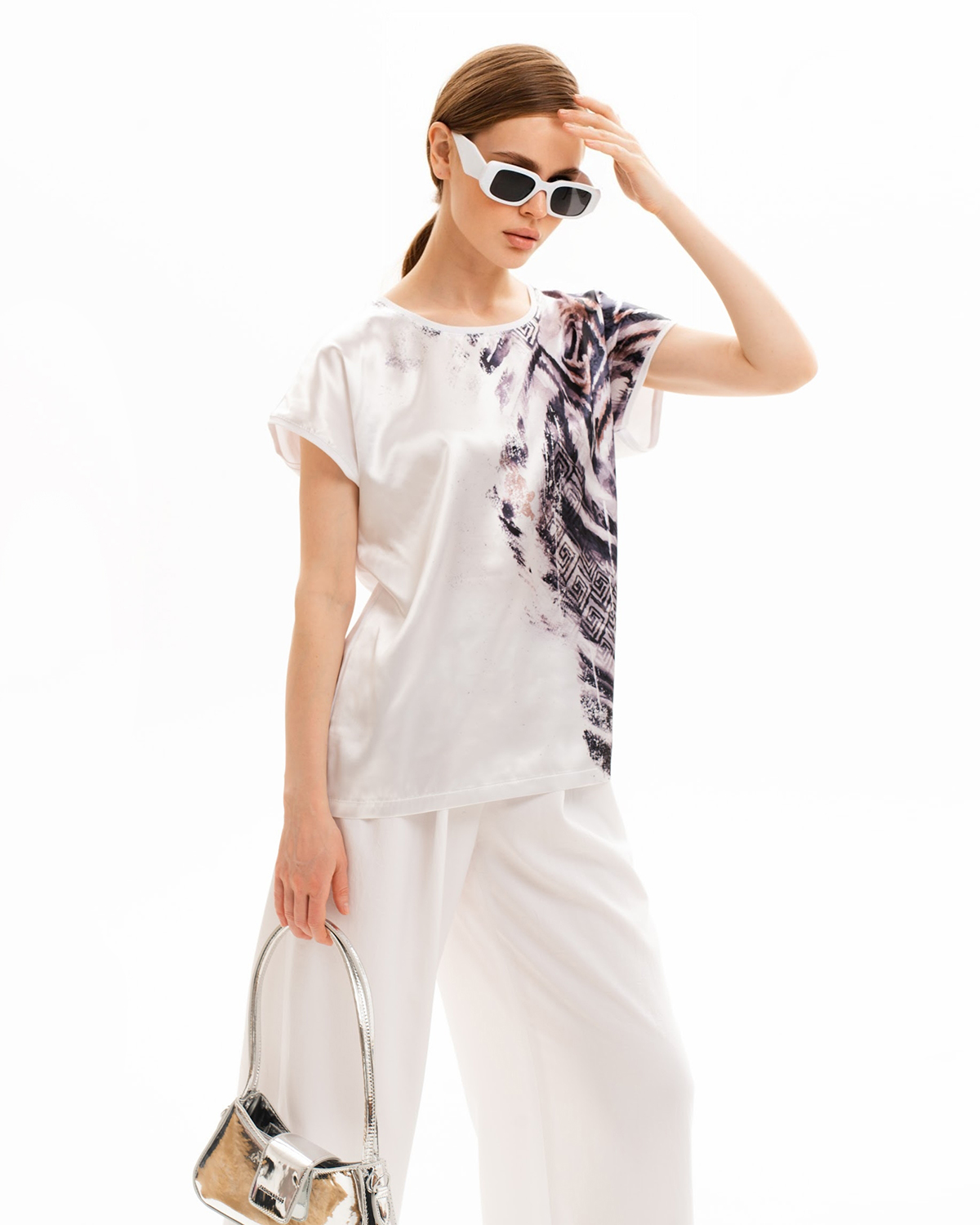Спереди туника с принтом сделана из атласного шелка, который имеет благородный блеск. Спинка изделия - из эластичного трикотажа, который компенсирует то, что шёлк не тянущийся материал, и обеспечивает хорошую посадку.