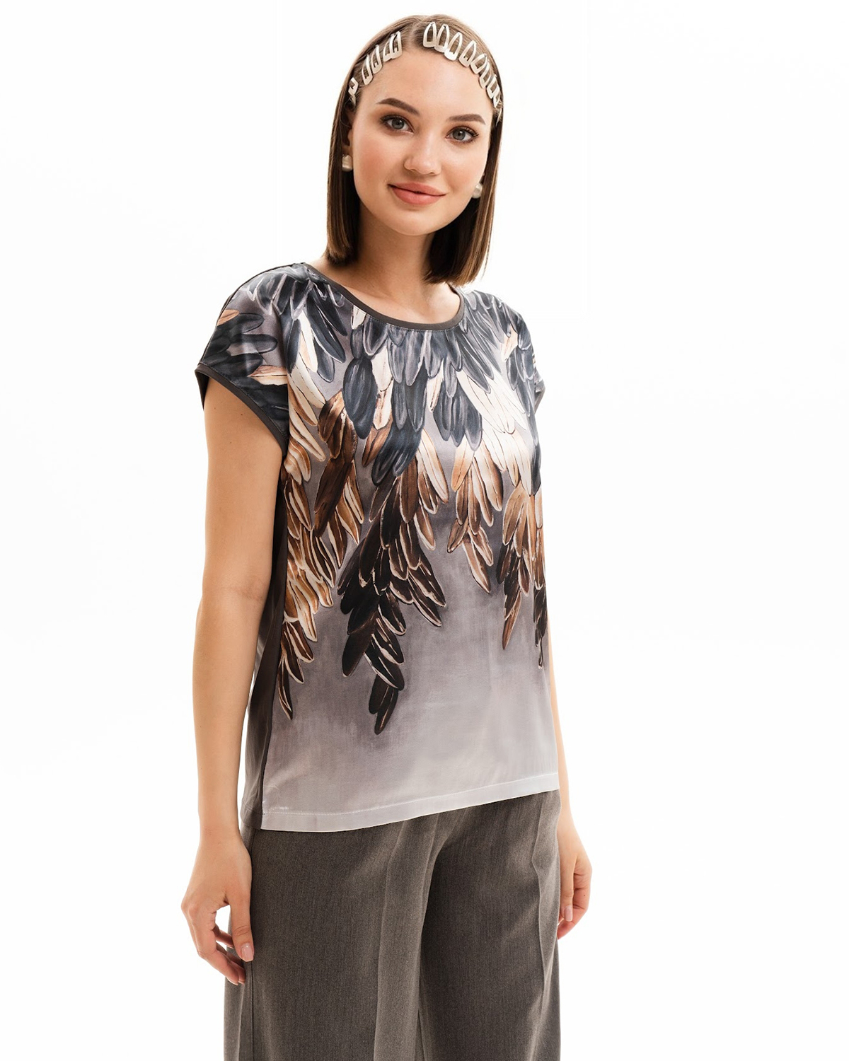 Спереди туника с принтом сделана из атласного шелка, который имеет благородный блеск. Спинка изделия - из эластичного трикотажа, который компенсирует то, что шёлк не тянущийся материал, и обеспечивает хорошую посадку.