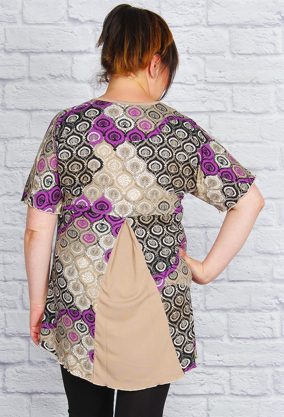 Женственная лёгкая туника из мягкой струящейся вискозы. Модель удлинённая, с оригинально оформленной спинкой, рукав цельнокроенный, низ изделия и рукава обработаны под оверлок, что придаёт изящности и воздушности образу. Такая блузка отлично подходит для дым с пышными формами.