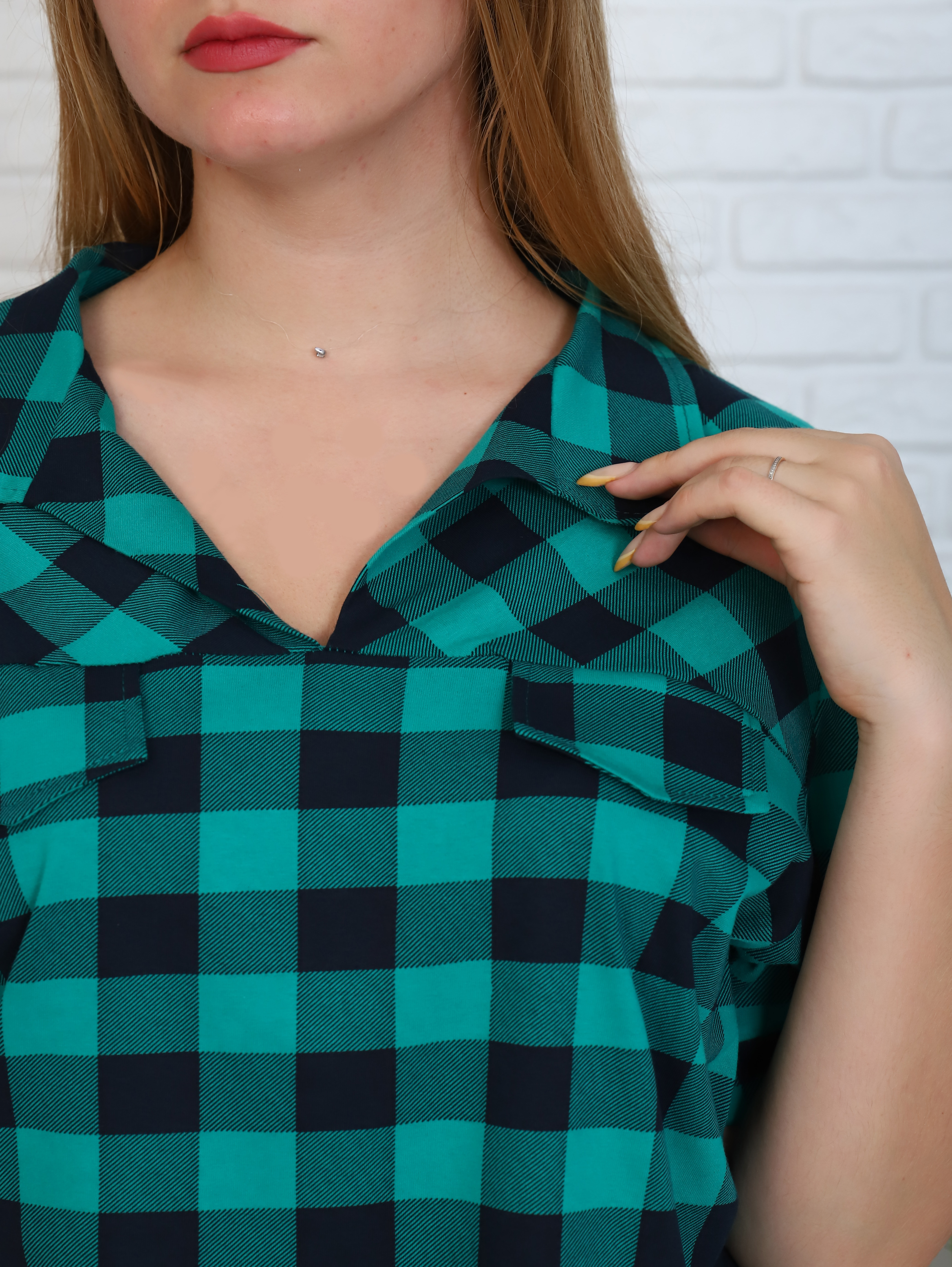 Удобная и стильная женская туника из мягкого хлопка. Модель с отложным воротником, с отрезной кокеткой и накладными клапанами, спинка немного удлинённая. Очень стильно смотрится с джинсами, шортами или леггинсами. Такая модель отлично подходит на любую фигуру и на разный возраст.