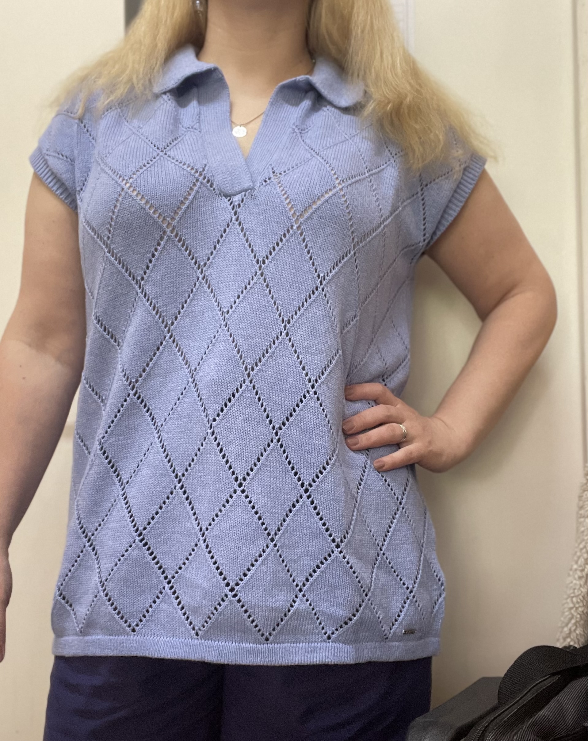 Удлиненный джемпер с отложным воротником и глубоким V-вырезом. Модель выполнена узорной вязкой из мягкой хлопковой пряжи. Тонкий ажурный трикотаж идеально подходит для теплой весны и лета, в нем будет комфортно и не жарко. Изделие дополнено фирменным логотипом бренда. Сочетается в костюме с юбкой D36.013 и очень хорошо со светлым денимом. 100%Хлопок