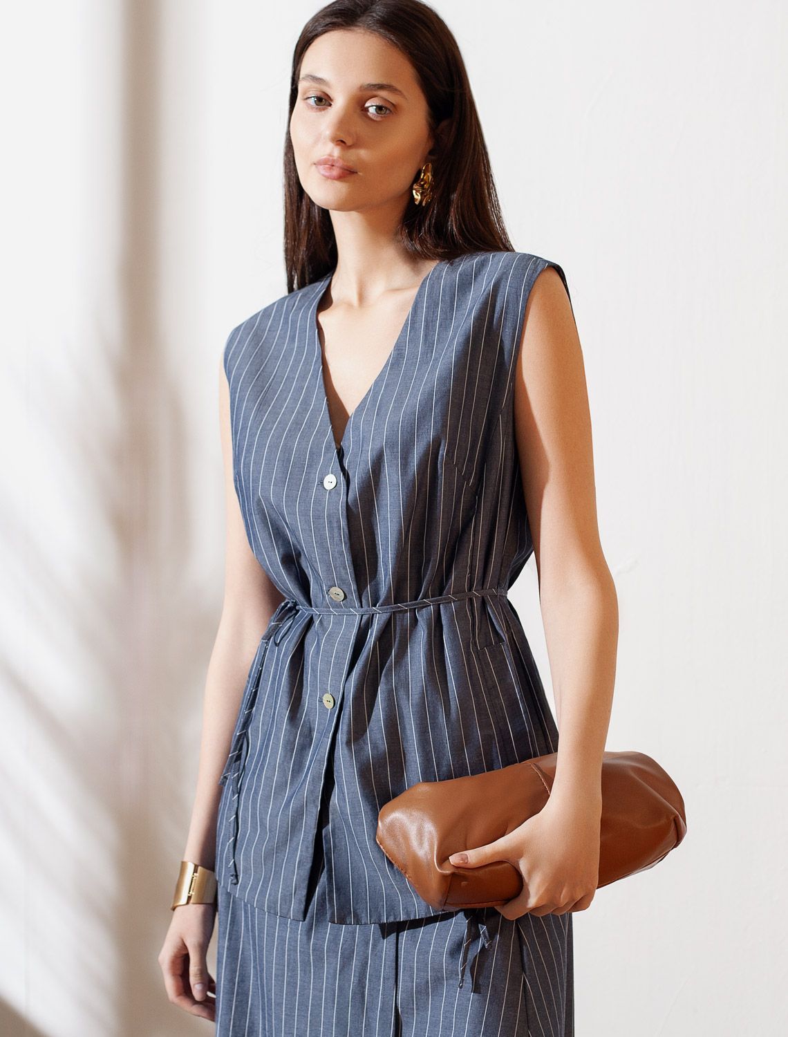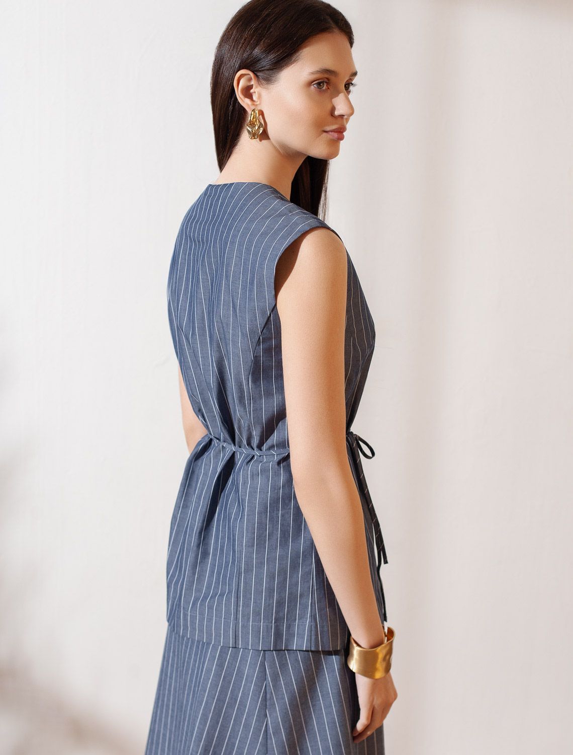 Удлиненный костюмный жилет в полоску с поясом из легкого хлопкового поплина