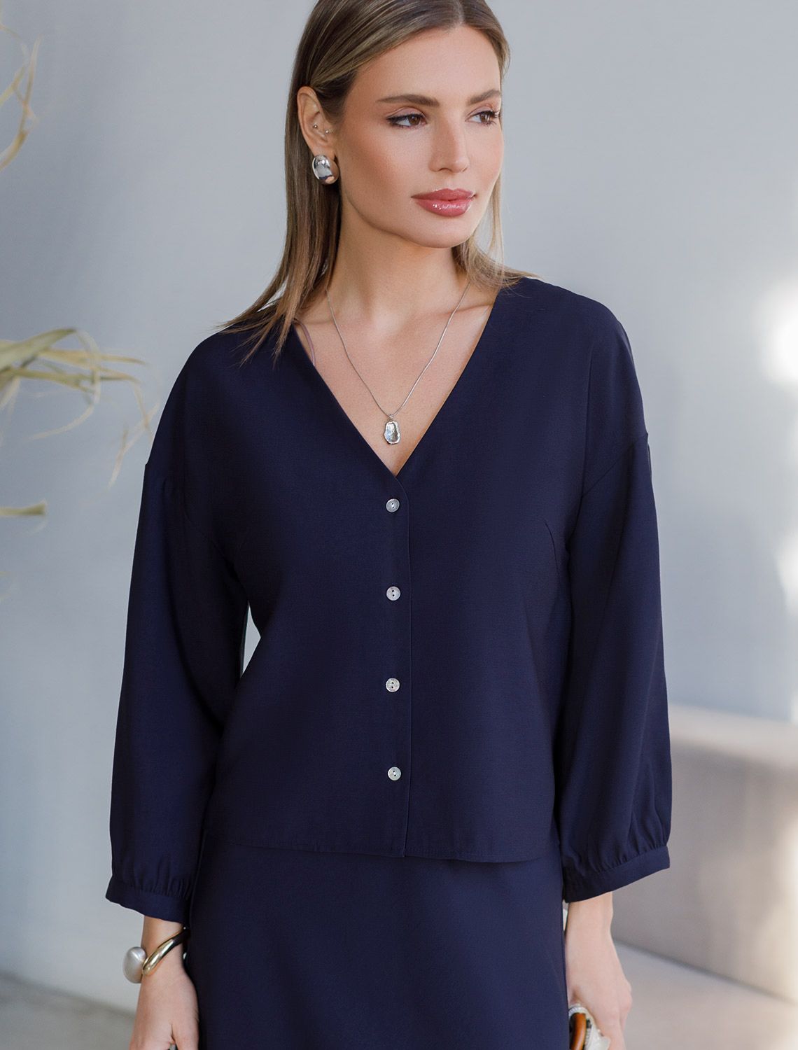 Элегантная укороченная блузка темно-синего цвета выполнена из плотного лиоцелла. Лиоцелл это более дорогой и экологичный вариант вискозы, очень прочный и шелковистый. Ткань отличается от регулярной коллекции из лиоцелла - она содержит еще больше лиоцелла (92%), благодаря чему имеет более нежную шелковистую фактуру. Модель дополнена объемными рукавами длиной 7/8, создающими модный акцент. Укороченная передняя часть блузки выгодно подчеркивает линию талии, а удлиненная спинка обеспечивает комфорт. Этот асимметричный фасон придает образу динамичности, а V вырез визуально вытягивает силуэт. Свободный крой романтиной блузки не сковывает движений и отлично садится по фигуре даже на большие размеры, скрывая возможные недостатки. Эта легкая блузка с застежкой на пуговицы идеальный выборо для комфорта и стиля в теплое время года, она идеально адаптируется под любой повод.
