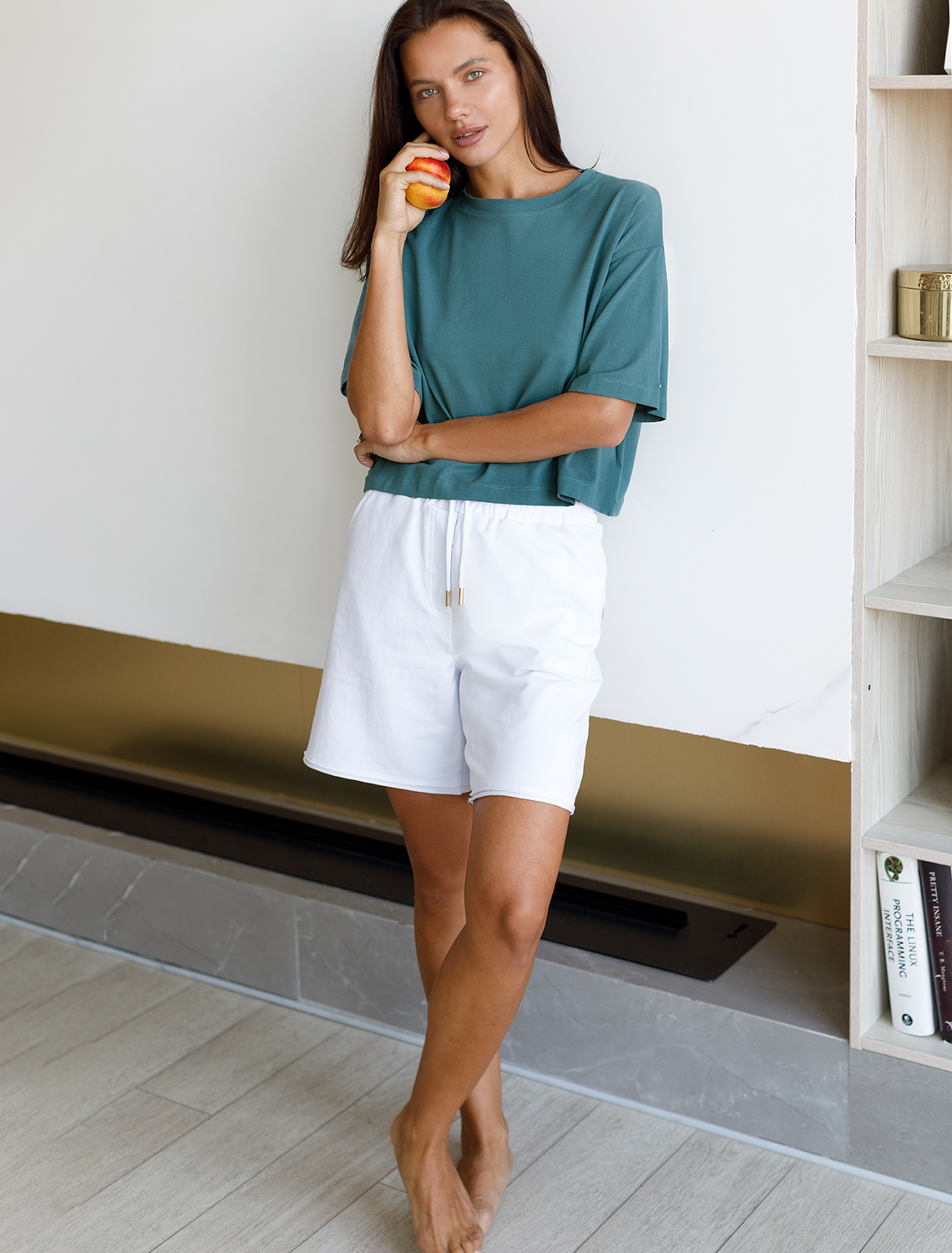 Укороченная футболка силуэта over-size сшита из премиального хлопка. Трендовый укороченный силуэт и базовая любимая вещь, которую можно носить не один сезон. Круглая горловина выполнена из эластичной рибаны. Ткань содержит небольшое количество эластана, за счет чего слегка тянется и не сковывает движения. На рукаве фирменный металлический логотип бренда. Сочетайте с брюками и юбками с высокой посадкой. Идеально на выпуск в жаркие дни.