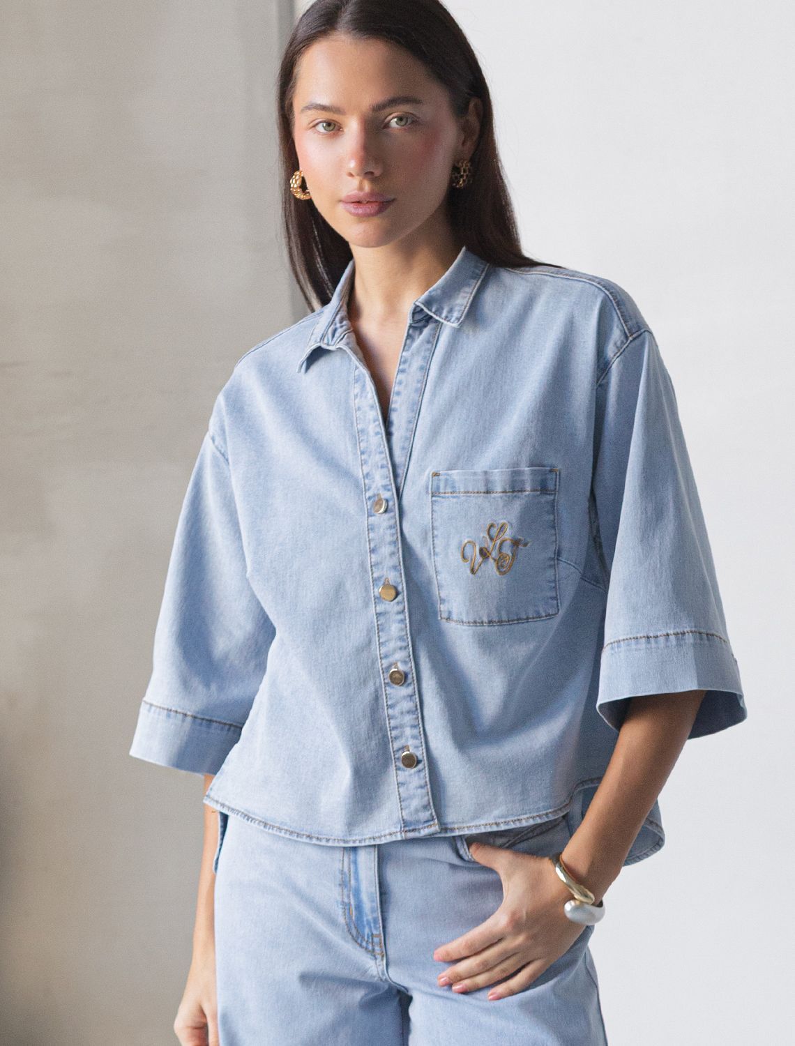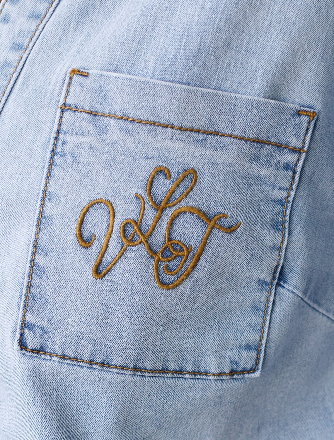 Укороченная рубашка светло-голубого цвета выполнена из облегченного денима плотностью 8 OZ. Джинсовая легкая рубашка идеально подходит для весны и лета. После пошива изделие подвергли специальному виду вошинга — salt-stone washing (солт-стоун вошинг), что дословно значит стирка с каменной солью. Такой вид вошинга позволяет получить стильные потертости на голубых оттенках денима. На кармане выполнена вышивка по авторскому эскизу дизайнера — буквы V L T, оформленные вензельным шрифтом. Сама вышивка выполнена техникой «застил» машинным способом. Свободная рубашка отлично подходит для создания летних образов или стильных ансамблей на каждый день засчет своей универсальности. Отложной воротник создает аккуратный внешний образ. Широкий рукав средней длины гарантирует свободу движений и удобство на весь день. Джинсовую блузку можно сочетать в стиле кэжуал, а также создавать монохромные образы или добавлять яркие акценты с помощью аксессуаров. Эта укороченная блузка на пуговицах станет базовым элементом гардероба для тех, кто ценит сочетание классики, моды и удобства.