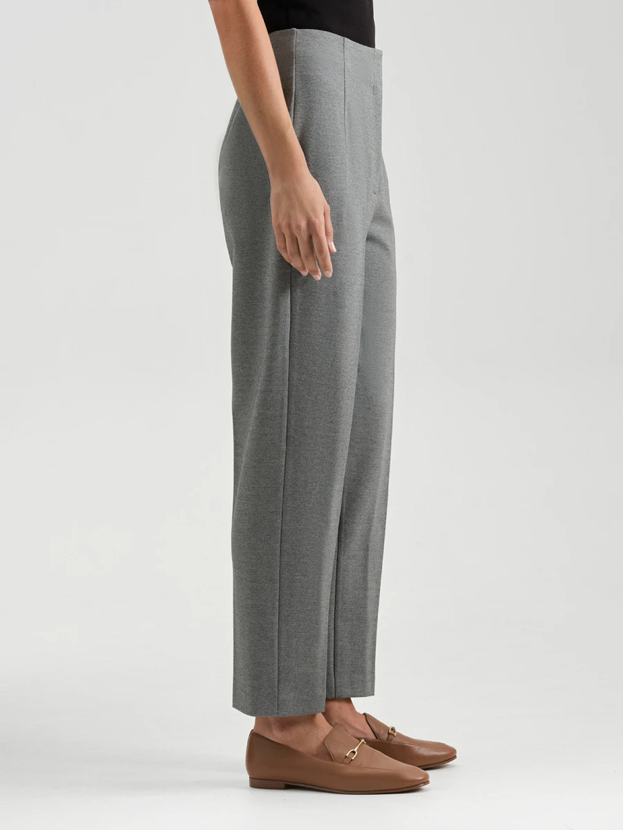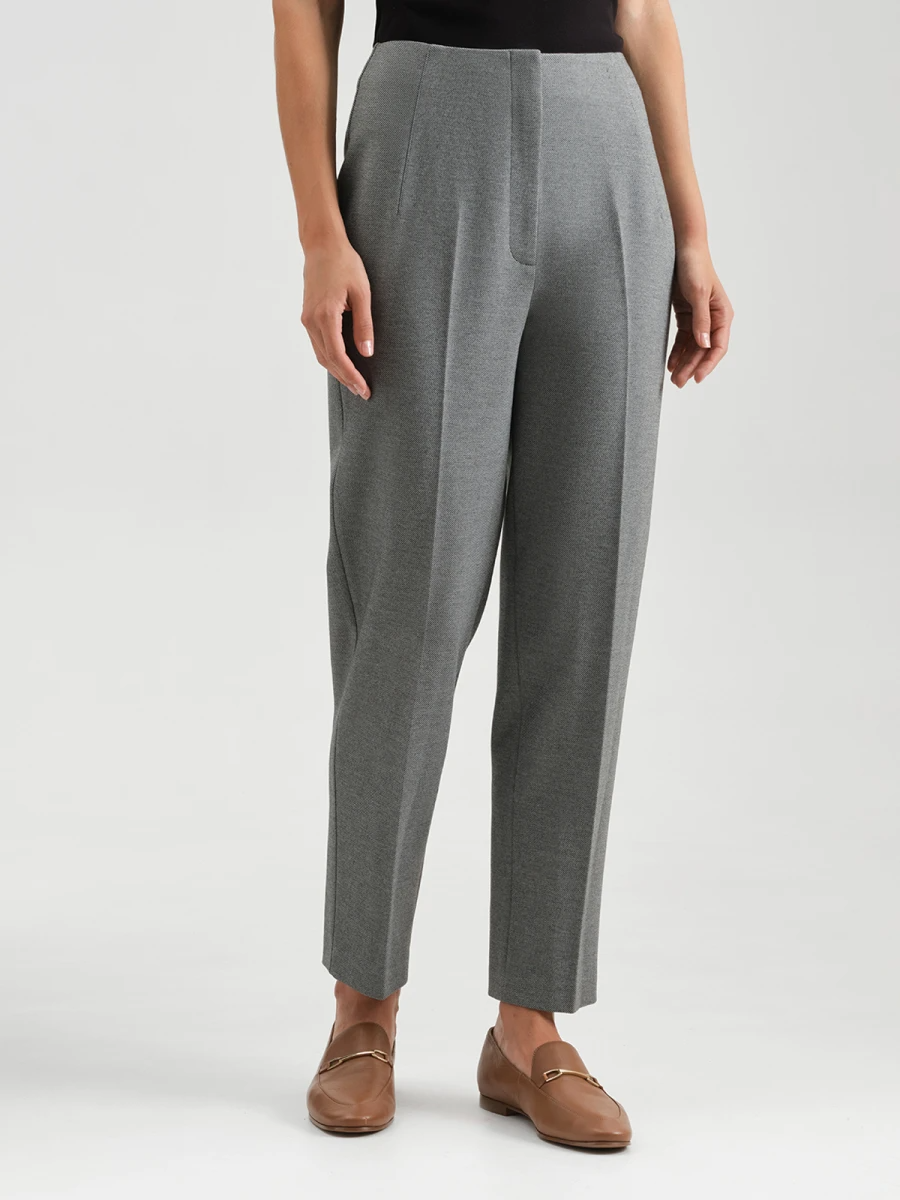 Укороченные классические брюки из плотной премиальной ткани в светло-сером оттенке. Модель на высокой посадке создает акцент на талии, а зауженный крой визуально округляет бедра. По всей длине проходят заутюженные вертикальные стрелки. Для максимального комфорта при носке и гармоничных пропорций дизайнерами нашего бренда были предусмотрены аккуратные вытачки на передней части изделия и сзади. Застегиваются брюки на потайную молнию и пуговицу