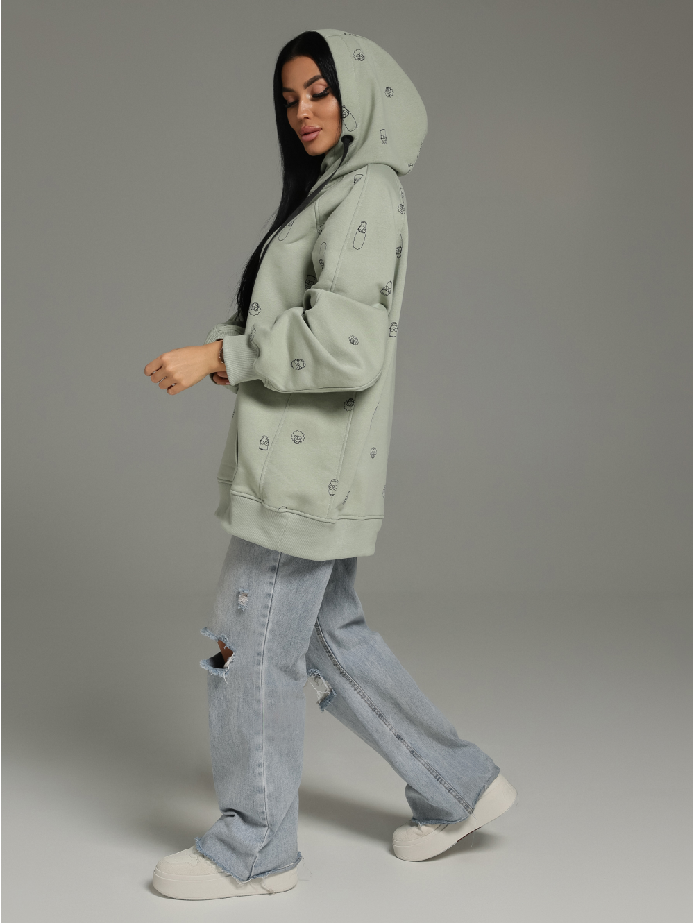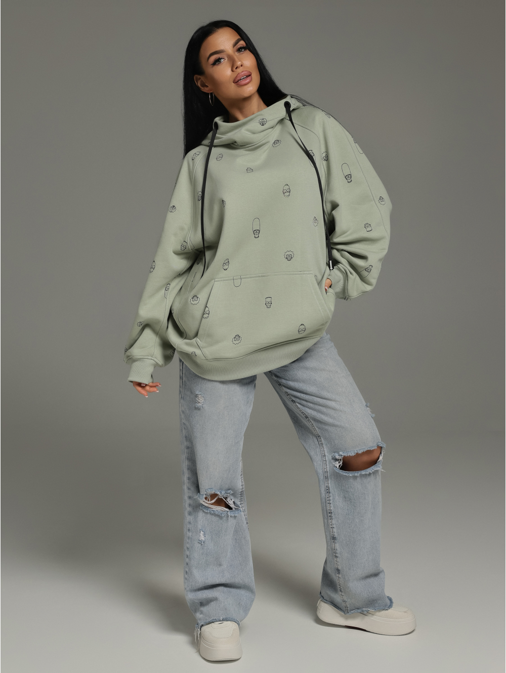 Худи – oversize кроя с притачным поясом по низу, с длинным рукавом реглан на манжете.