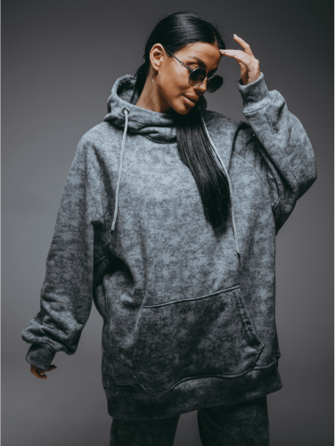 Худи – oversize кроя с притачным поясом по низу, с длинным рукавом реглан на манжете.