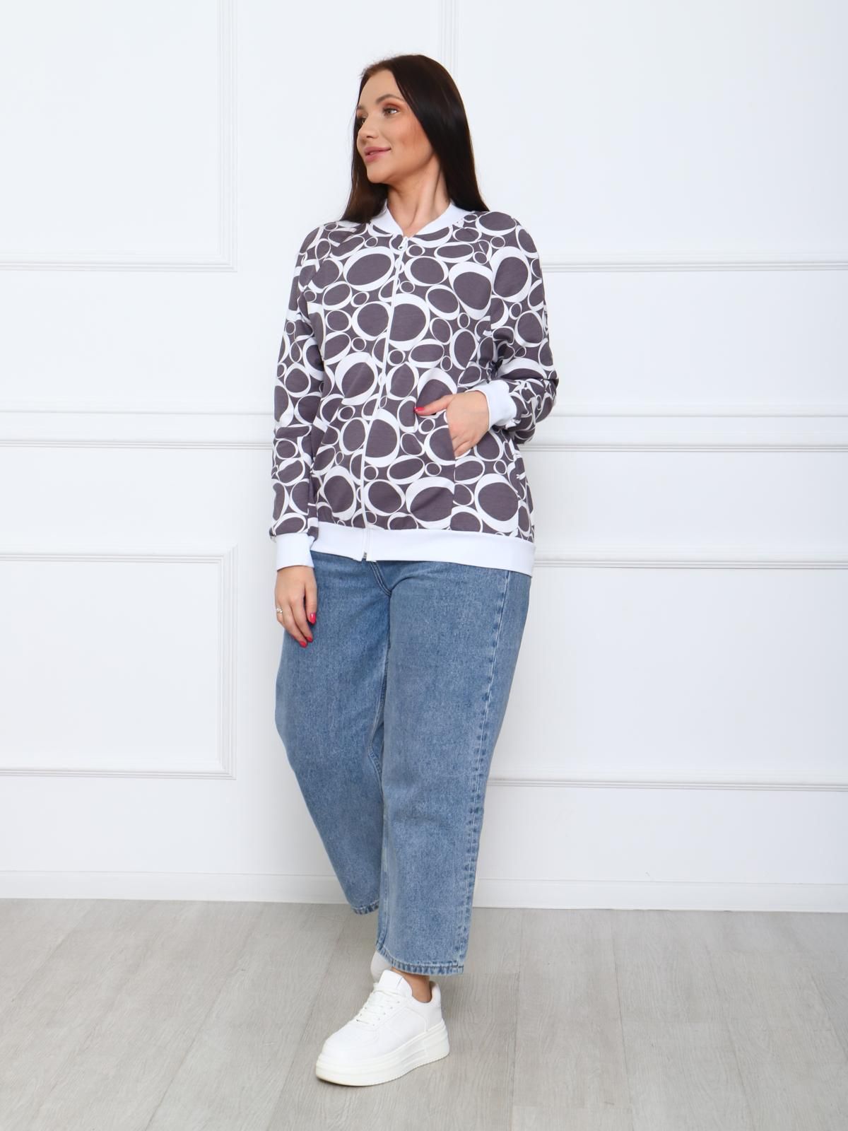 Женский бомбер выполнен из ткани футер двунитка с лайкрой. Бомбер прямого покроя, рукав реглан, в рельефных швах переда-карманы, застежка-молния, воротник, манжеты рукавов и пояс бомбера выполнены из однотонного футера в тон изделия.